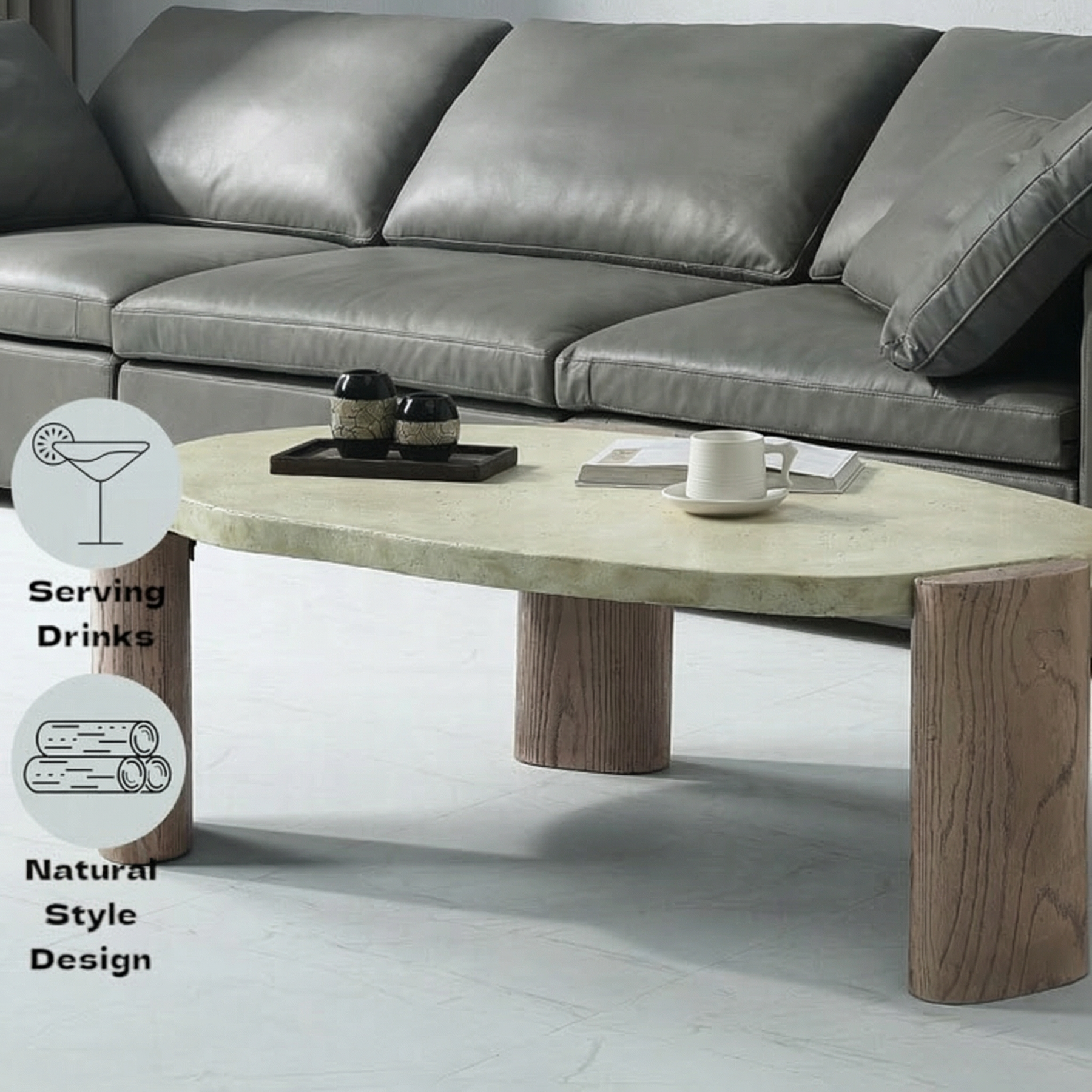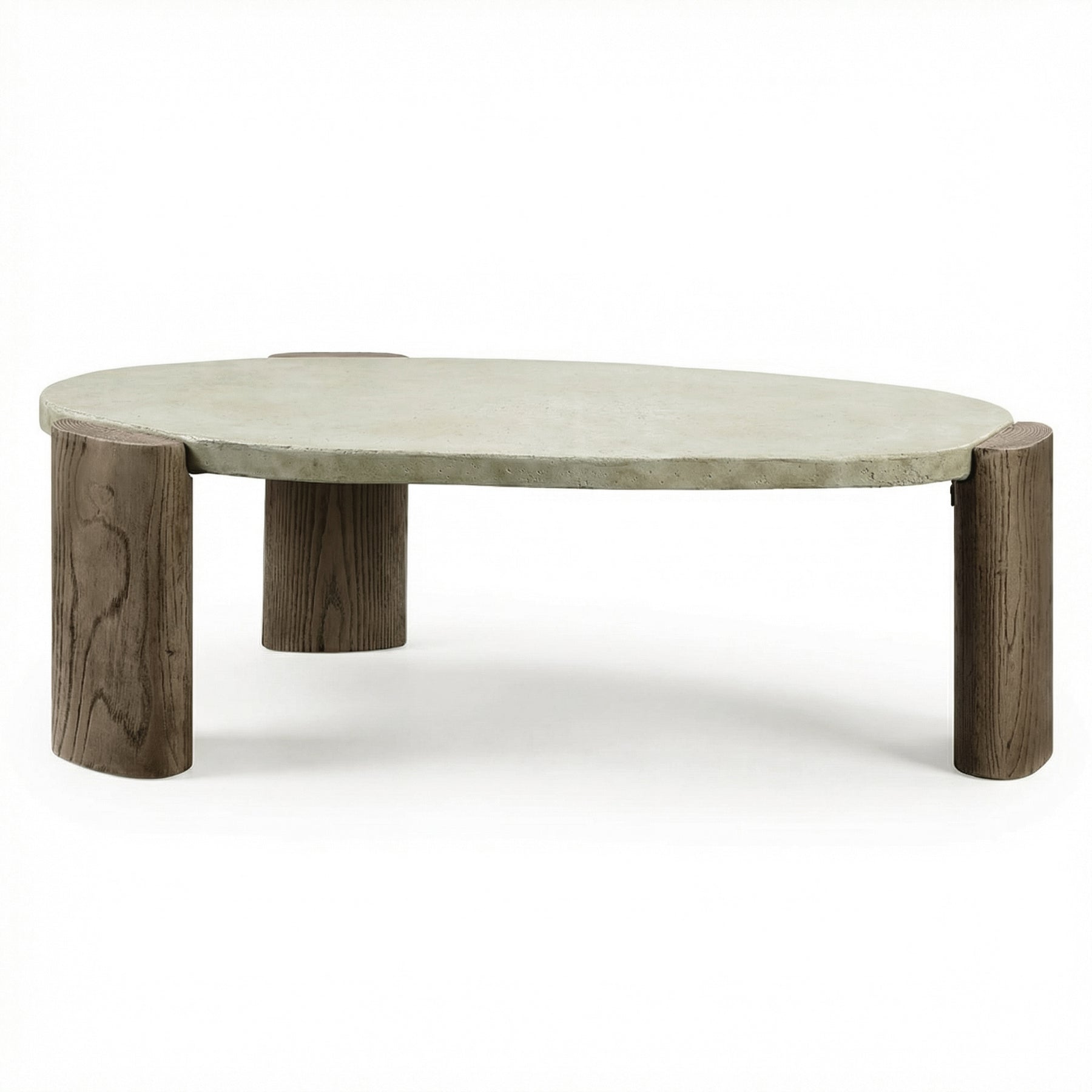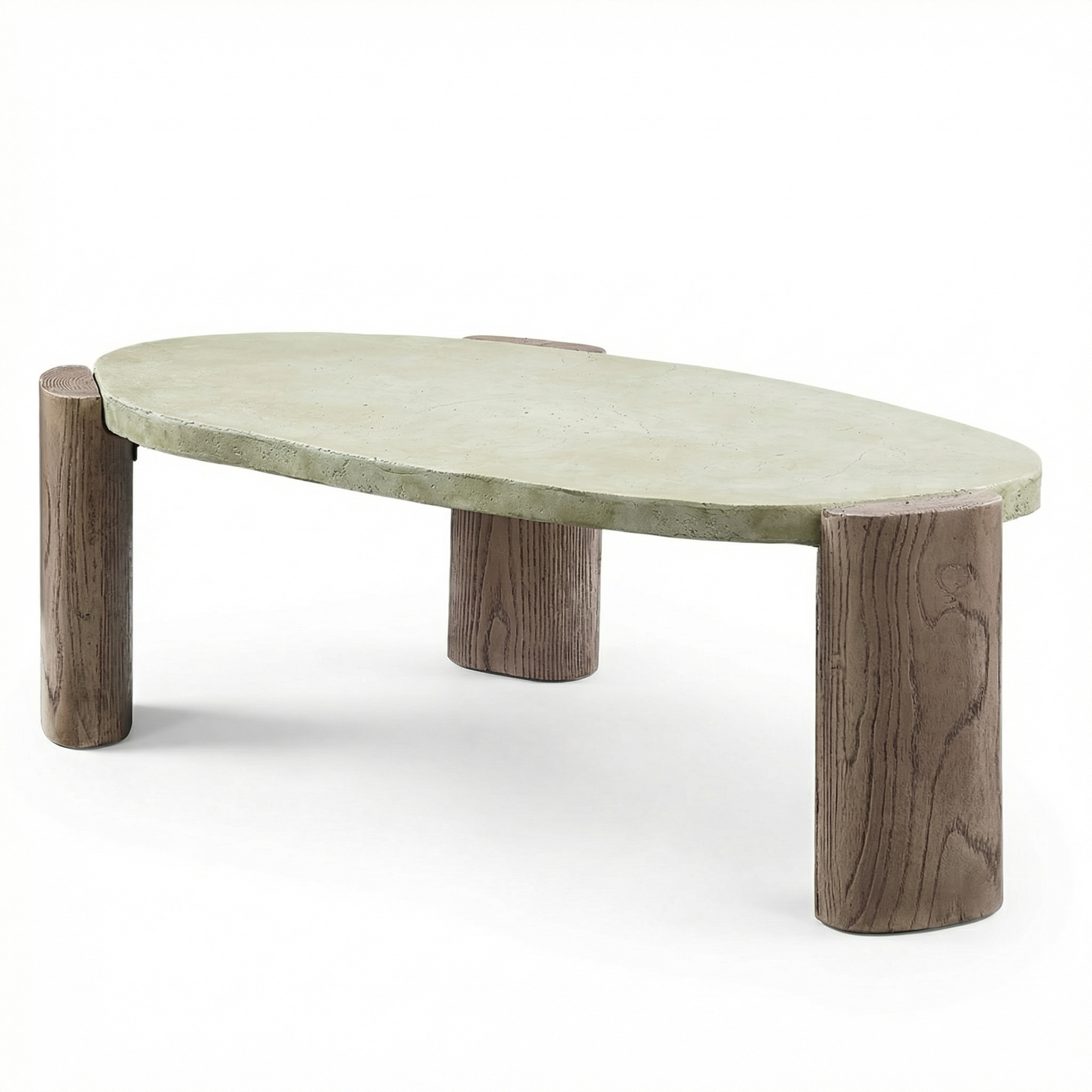 Crafted from environmentally friendly cement, this oval coffee table features a smooth, stone-like tabletop paired with wood-grain textured legs, blending raw material beauty with refined modern design. Each piece showcases subtle variations for a truly one-of-a-kind look.