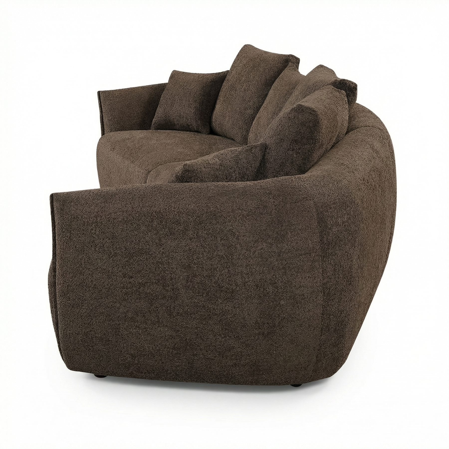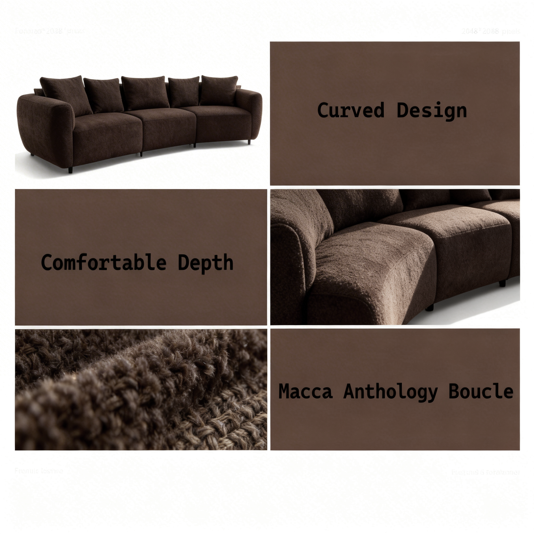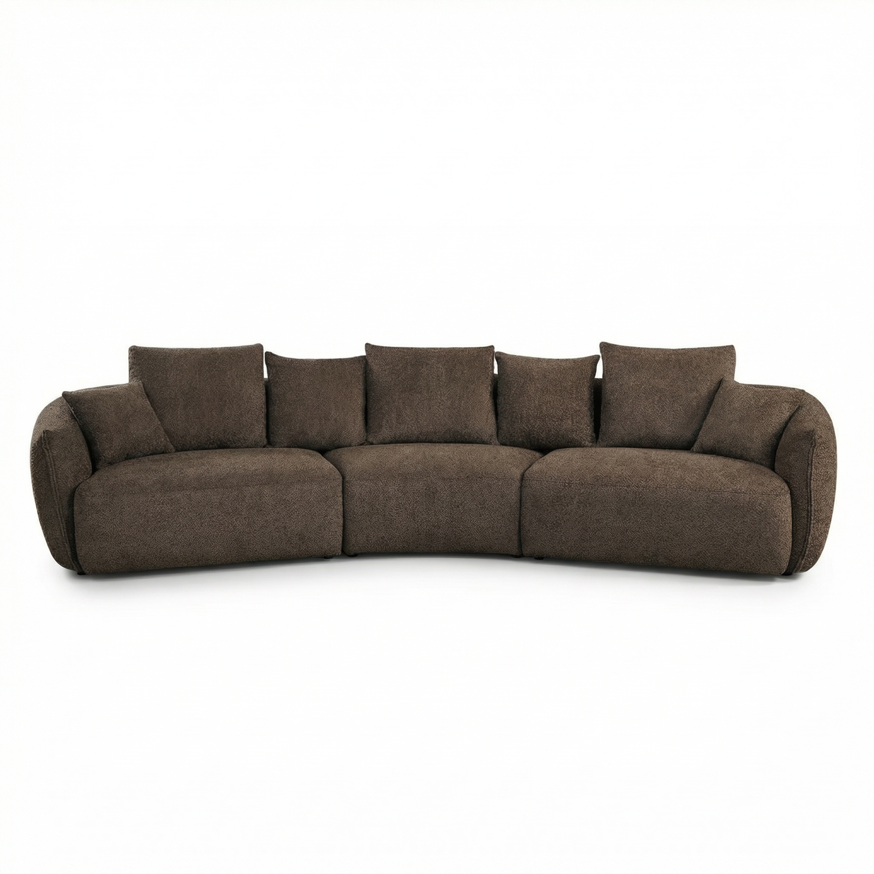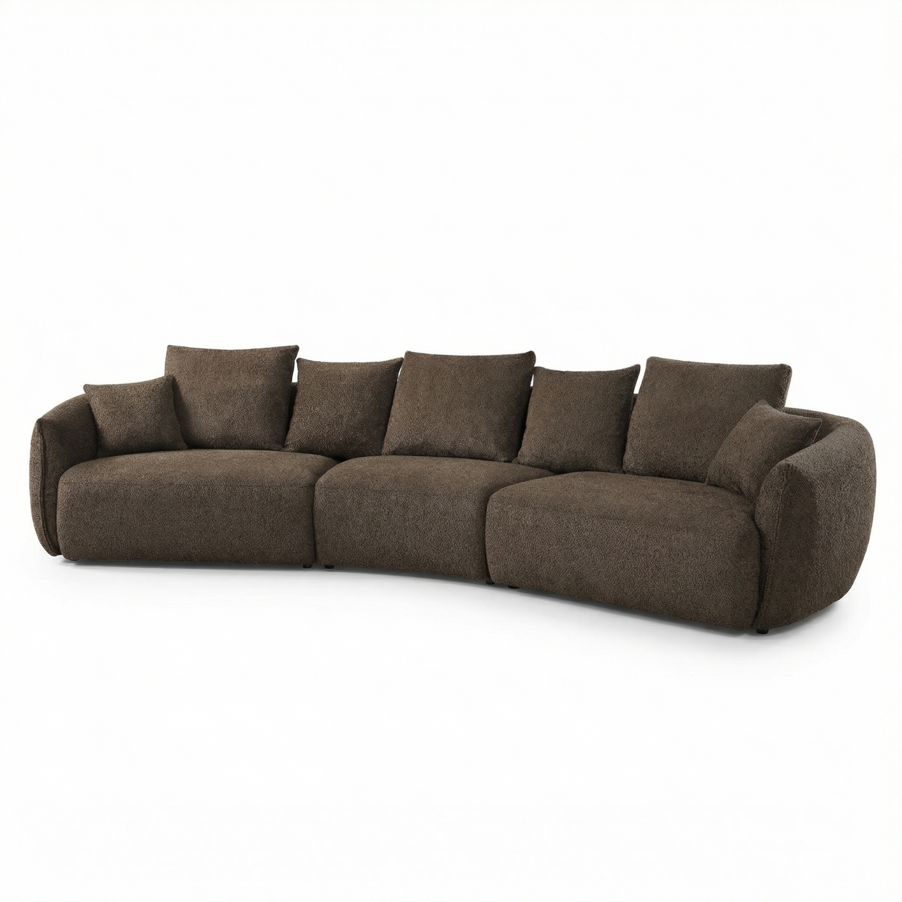 The Mocha Curved Sectional Sofa brings warmth and sculptural balance to modern living spaces. Wrapped in rich mocha-toned bouclé, its softly rounded silhouette creates a relaxed yet refined presence. Generous cushioning and a seamless curved form invite conversation, lounging, and everyday comfort, making it a natural focal point in open-plan interiors.