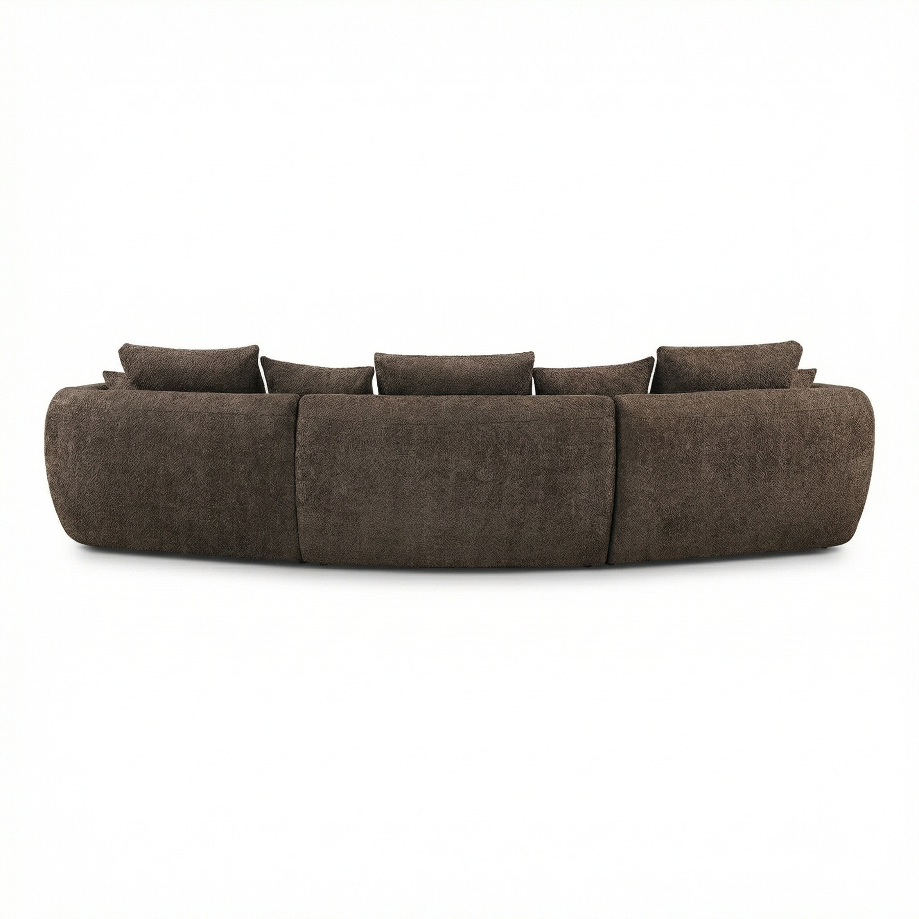 Designed to be admired from every angle, the Mocha Curved Sectional Sofa features a continuous, fully upholstered back that looks as good from behind as it does from the front. Its fluid curves and deep, earthy tone allow the sofa to sit confidently in the center of a room, offering both visual harmony and inviting comfort without compromise.