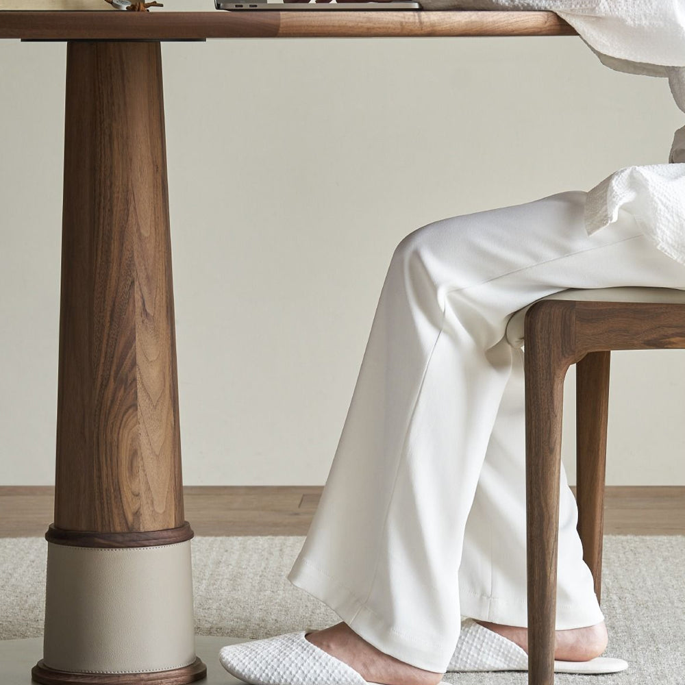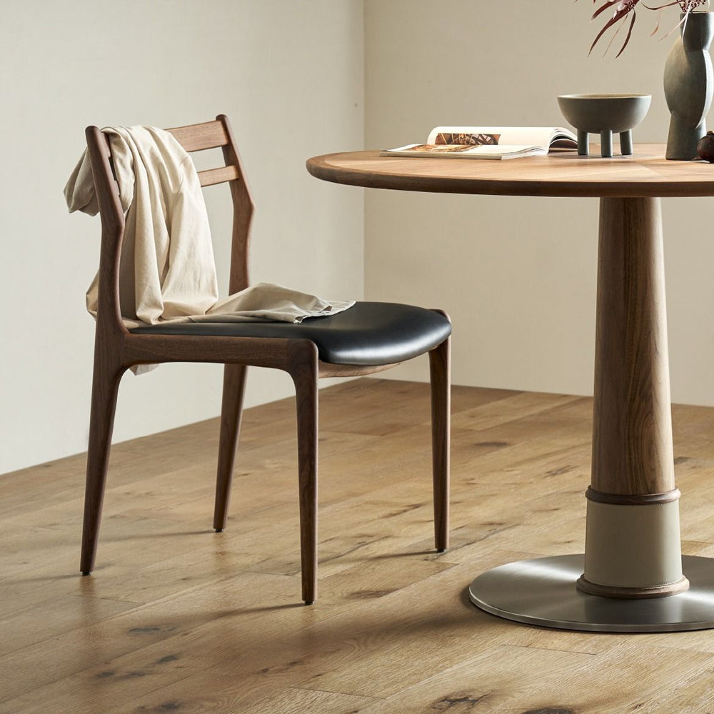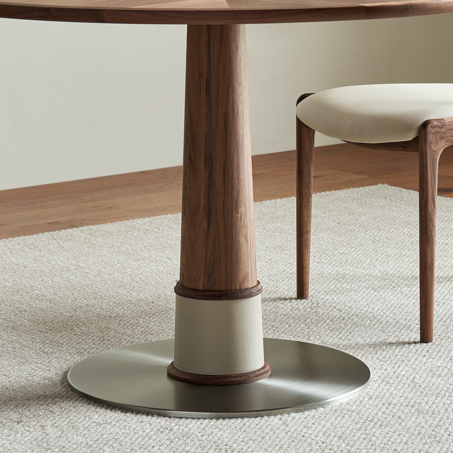 The Kamile Round Dining Table blends timeless solid wood craftsmanship with modern pedestal design. Its round tabletop encourages better conversation and connection, while the single-leg base maximizes seating flexibility and saves space. Finished with a matte brushed stainless steel base and reinforced with a hidden weighted core, Kamile offers exceptional stability and everyday durability. A perfect round dining table for modern, Scandinavian, or mid-century inspired interiors.