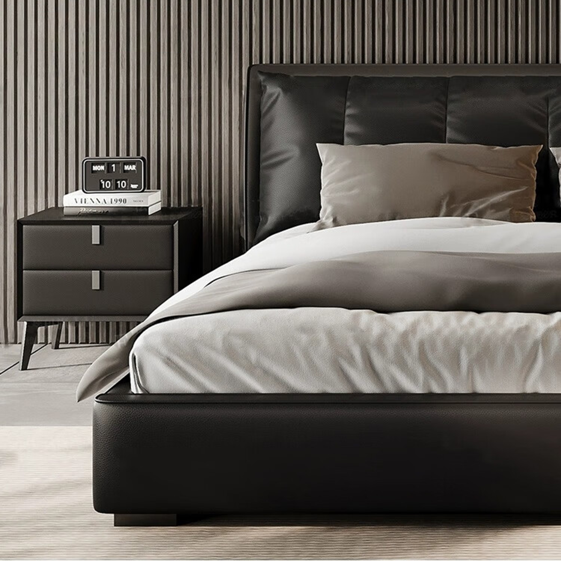 Crafted with smooth, high-quality vegan leather, this bed brings a refined Italian minimalist look to your bedroom. The soft-touch finish adds a sense of everyday comfort while elevating the space with clean, modern aesthetics.
