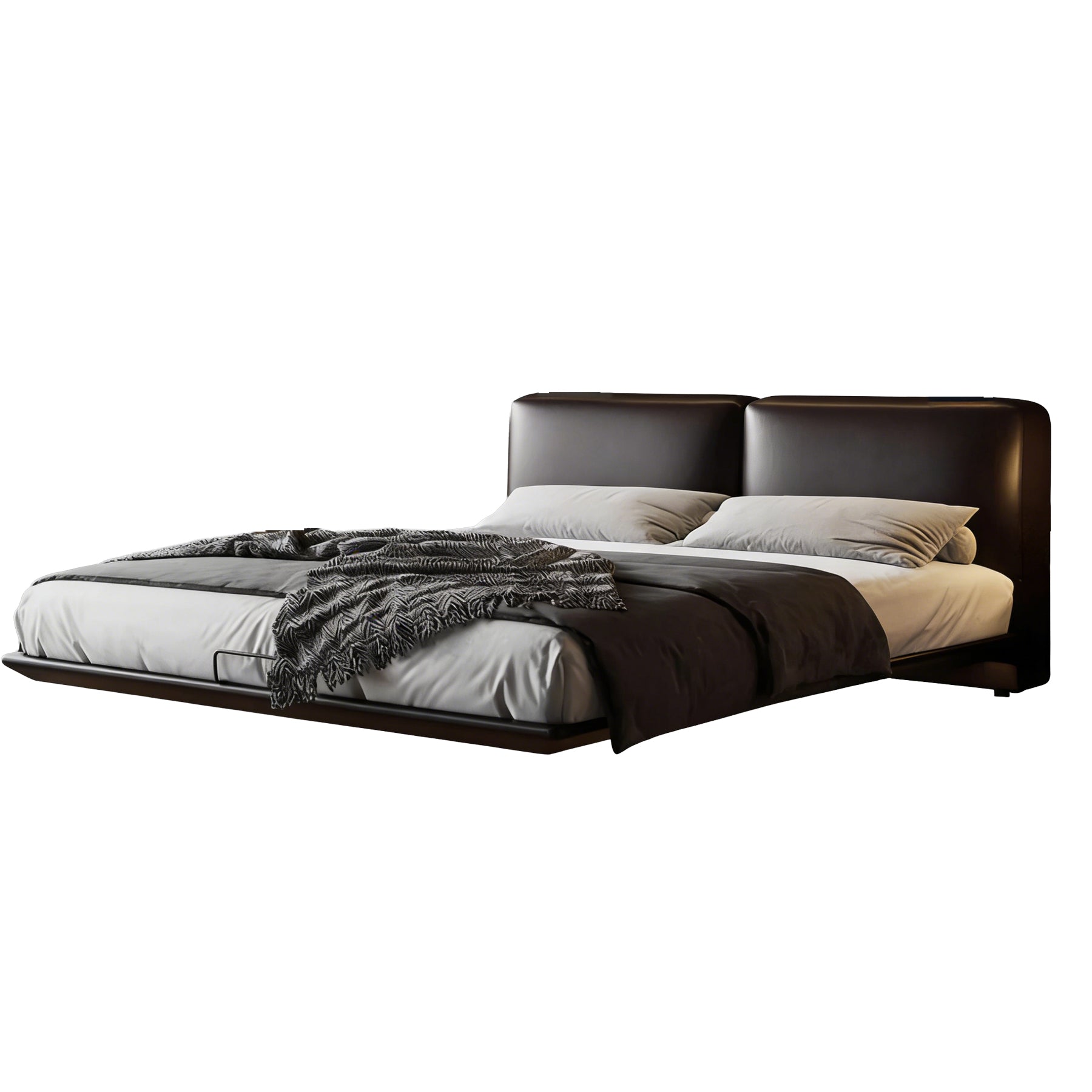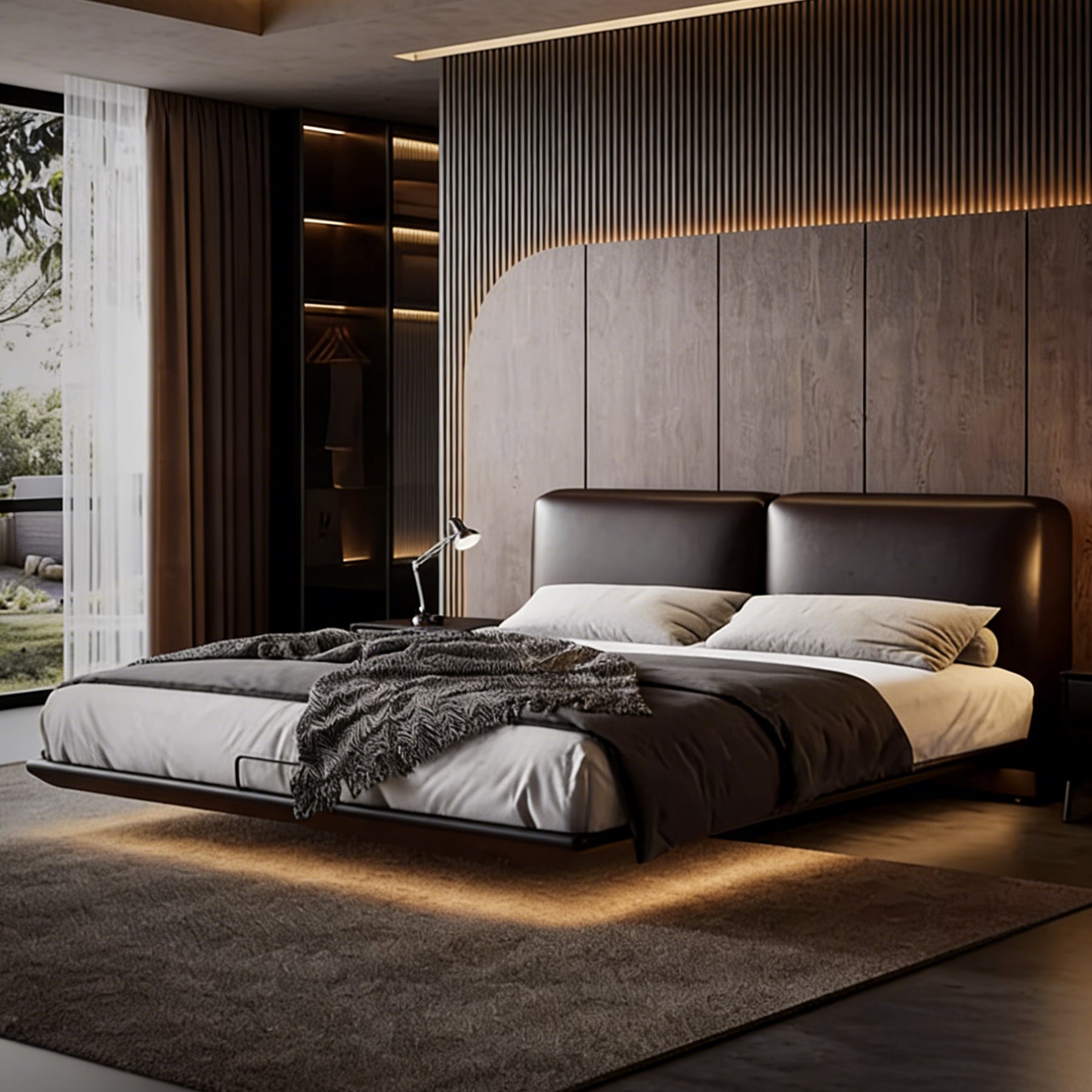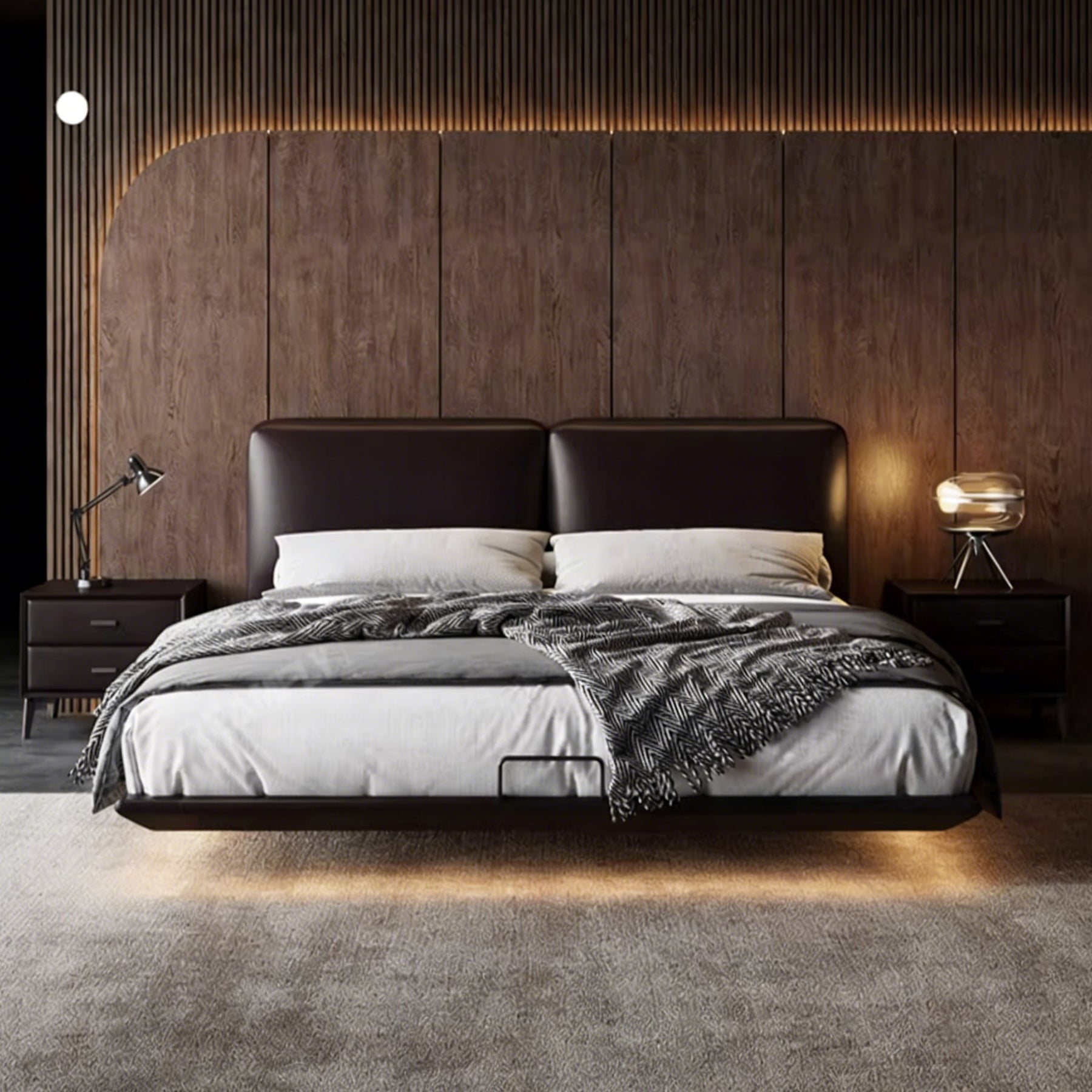 The Domus Leather Floating Bed brings modern elegance to your bedroom with its signature floating design and refined vegan leather upholstery. A softly padded headboard provides everyday comfort, while warm under-bed lighting adds depth and ambiance to the space. Designed to balance style, comfort, and stability, this modern platform bed is a striking centerpiece for contemporary interiors.