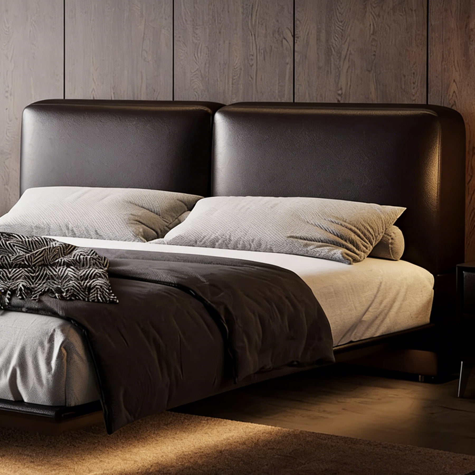 The Domus Leather Floating Bed features a sleek floating platform that creates a light, modern silhouette. The recessed base gives the bed a subtle “hovering” effect, bringing a refined, contemporary presence to any bedroom.