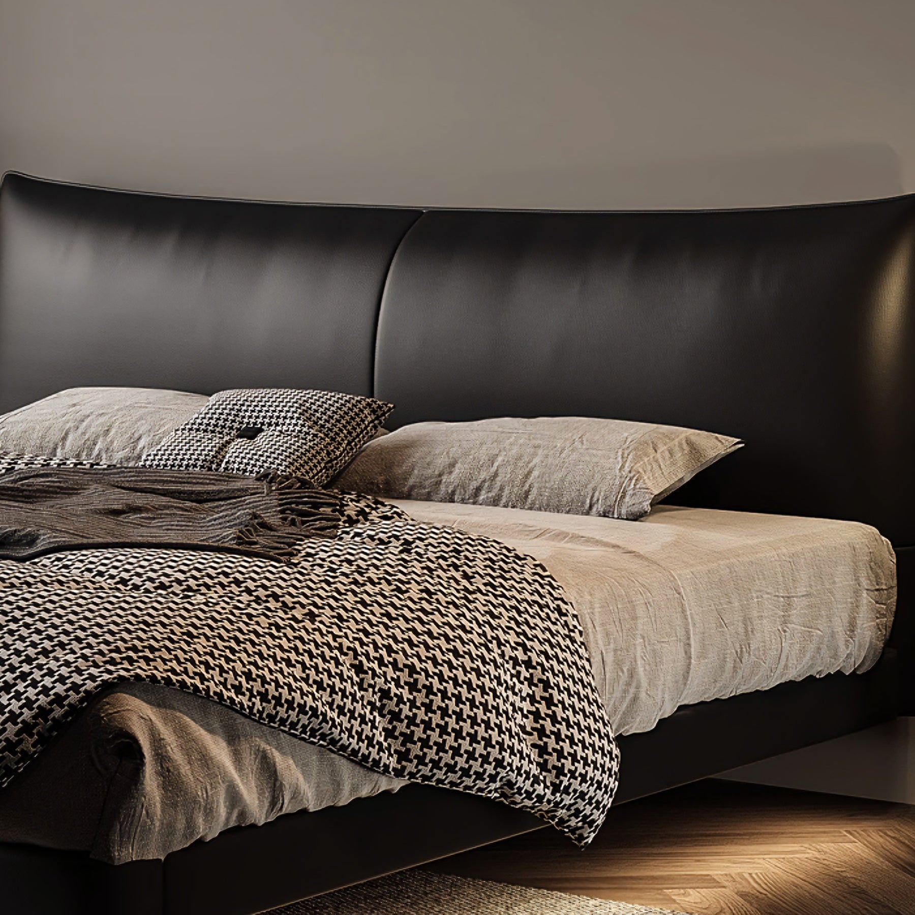 A gently curved, fully upholstered headboard offers comfortable back support for reading or unwinding, blending softness with a structured modern form.