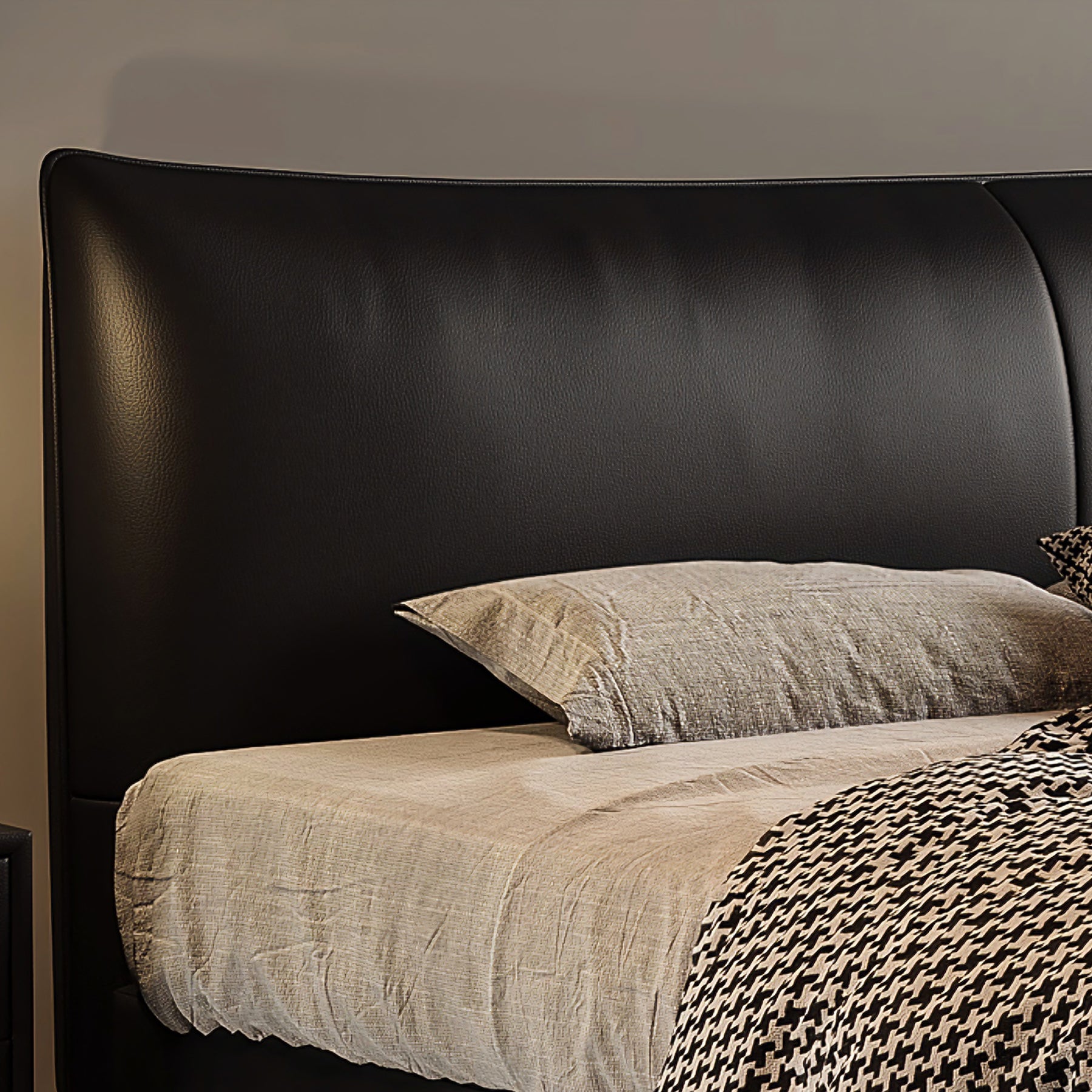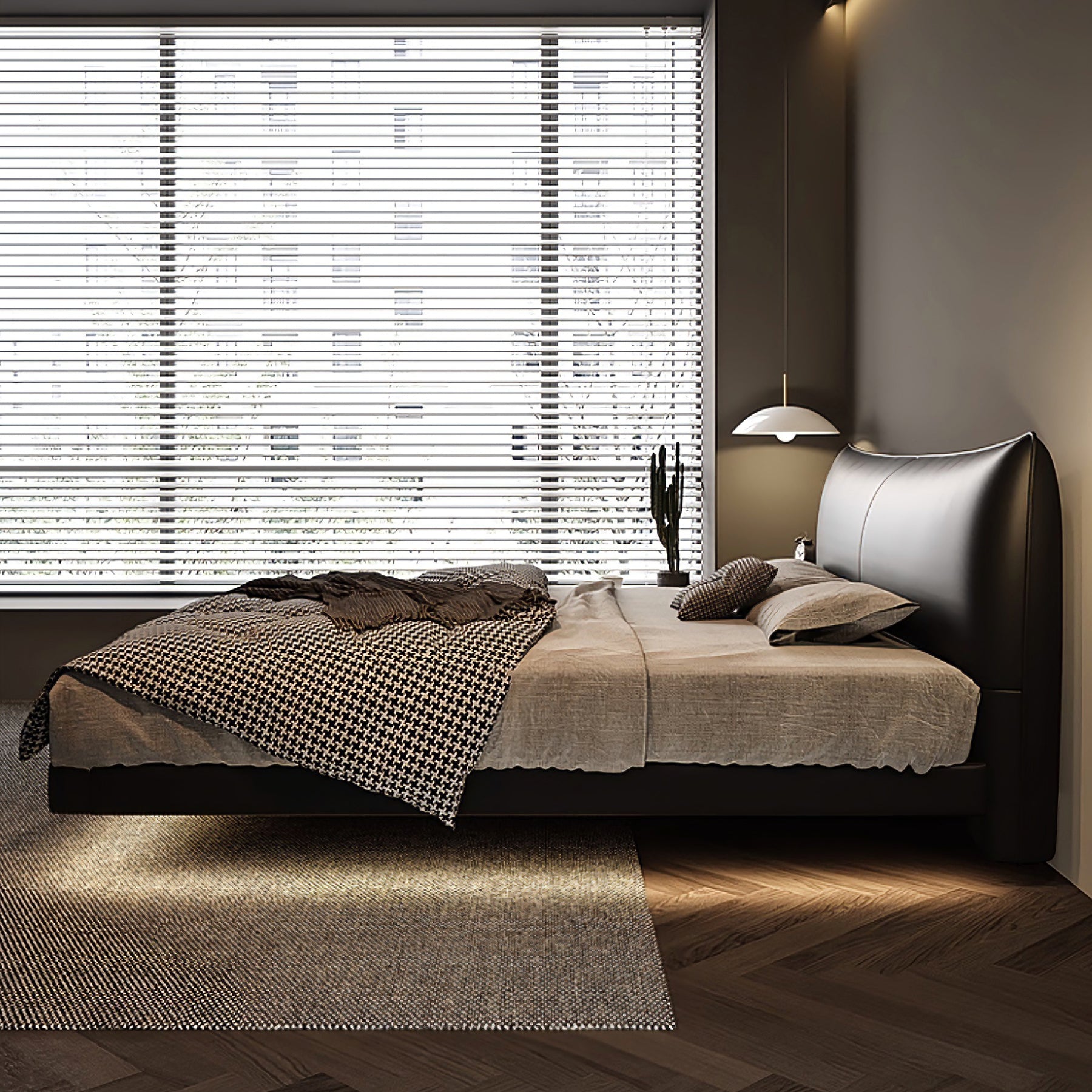 A gently curved, fully upholstered headboard offers comfortable back support for reading or unwinding, blending softness with a structured modern form.
