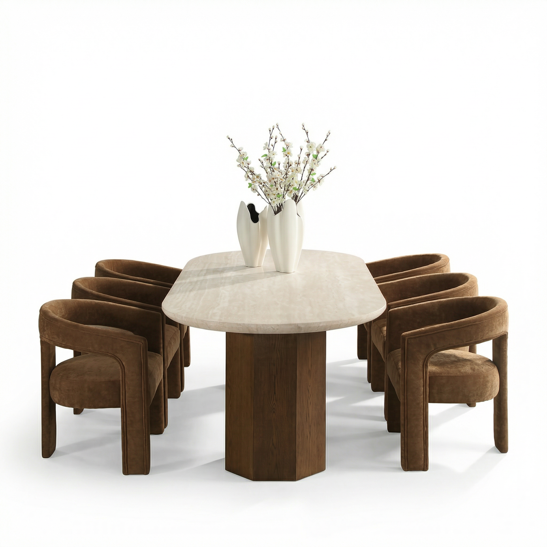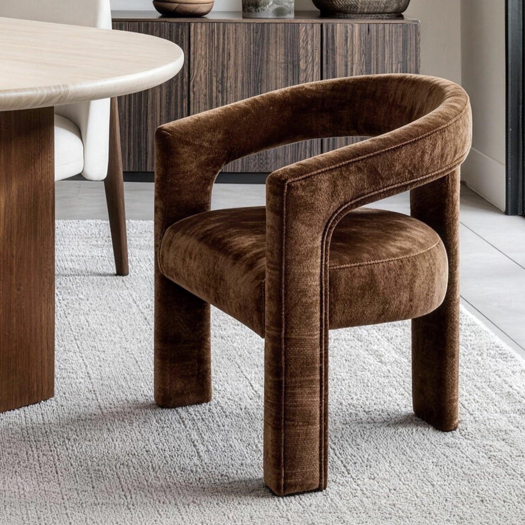 The Vale Upholstered Dining Chair brings warmth and understated elegance to the dining space. Upholstered in soft brown velvet, it offers a rich texture that feels inviting while adding depth to modern and transitional interiors. The gently contoured seat provides comfortable support, making it ideal for long meals and relaxed conversations. Balanced in both form and function, Vale blends seamlessly with wood, stone, or marble dining tables.