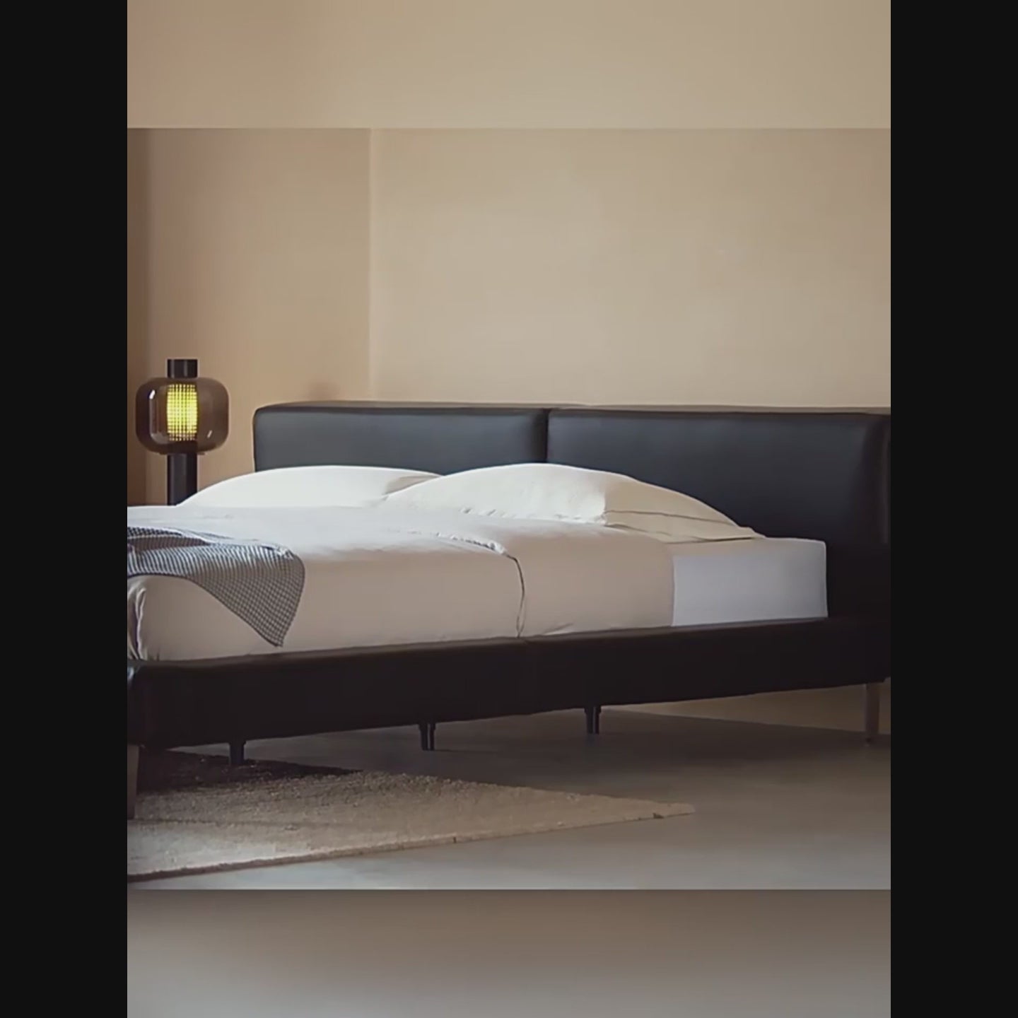 Wrapped in rich, charcoal-toned genuine leather, the thick, cushiony bed frame evokes the comfort of a toasted square. Slim stainless steel legs create a striking visual contrast, lifting the structure lightly off the ground — as if floating mid-air. It’s bold yet weightless, structured yet serene.