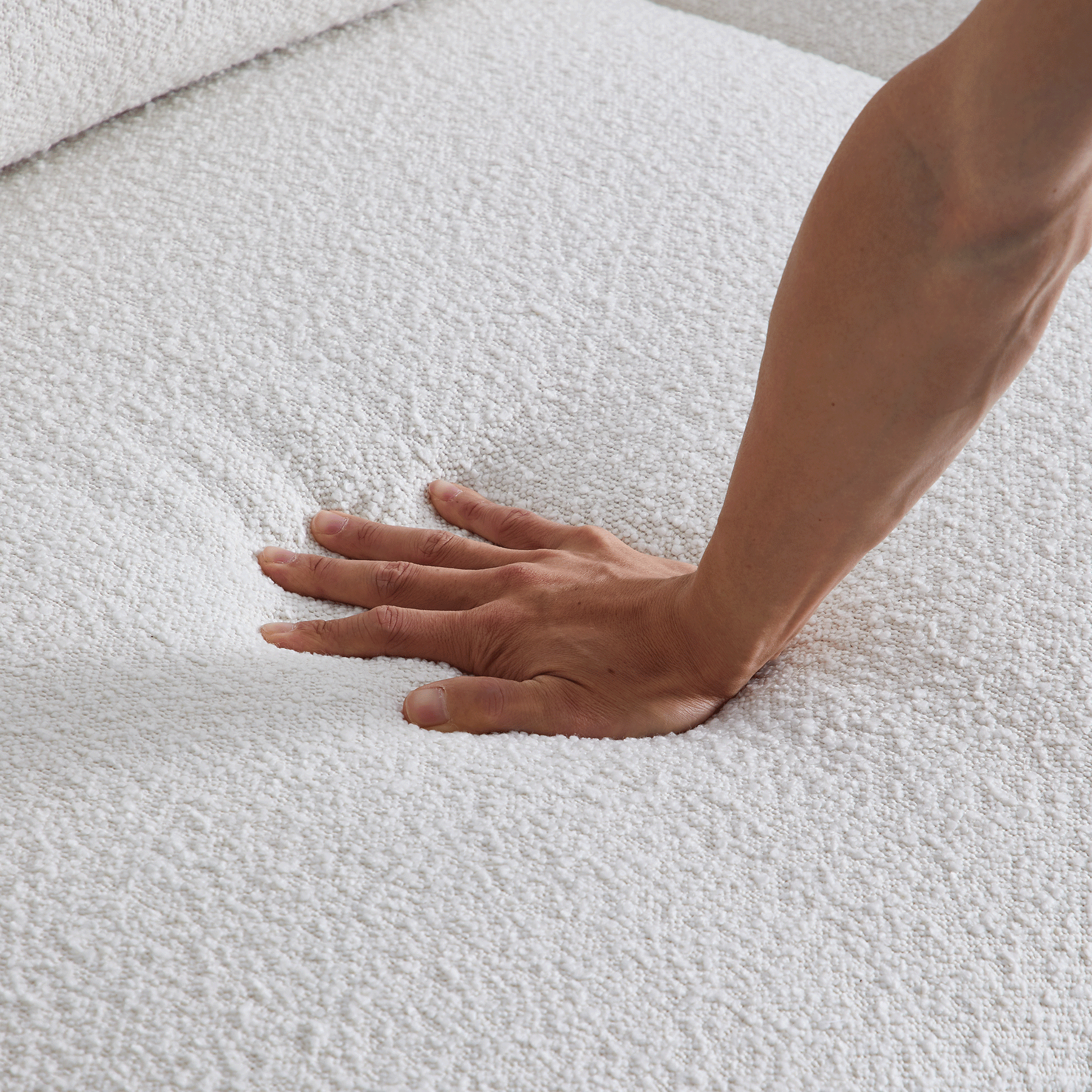Crafted with high-quality bouclé upholstery that resists water, coffee, milk, and soda stains. A quick blot with a clean cotton cloth keeps it looking fresh and spotless.