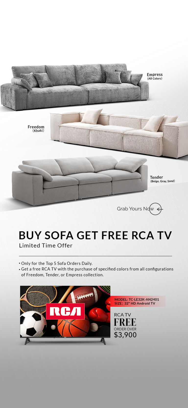 We were thrilled to have RCA showcase our furniture brand at CES, the renowned international electronics exhibition in this January. This collaboration highlighted the perfect synergy between Soka Home's modern furnitures and RCA's innovative televisions, creating a seamless and immersive home entertainment experience for living rooms. Seizing this opportunity and embracing the spirit of love this February, we are pleased to announce a series of special promotions: Customers who purchase a specific series of sofas will receive a complimentary RCA television.