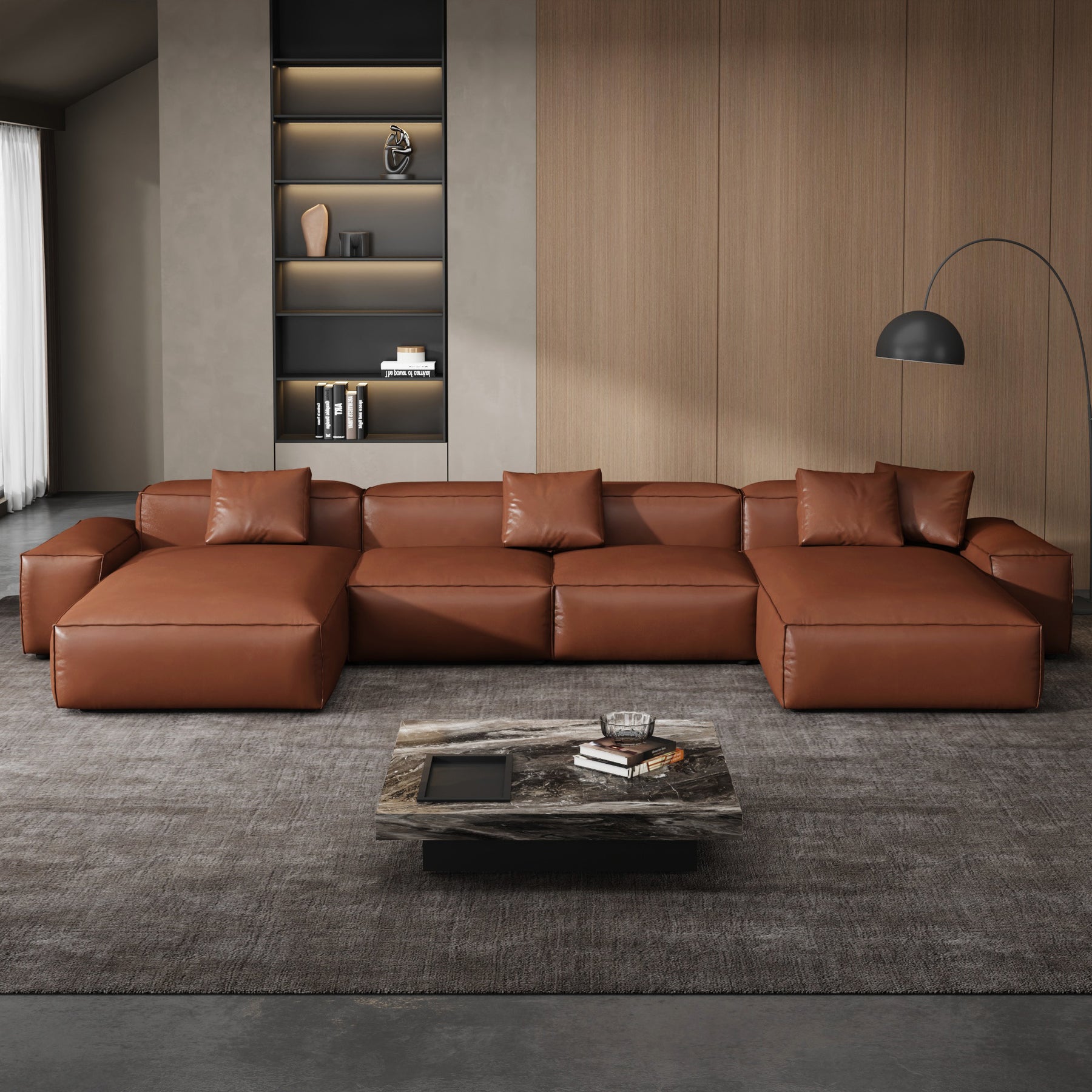 The Cube Modular Brown Genuine Leather U-Shaped Sectional combines contemporary design with lasting comfort. Upholstered in genuine leather, this spacious sectional features a versatile U-shaped layout, deep seating, and clean lines that bring both style and functionality to your living room. Perfect for gatherings or everyday lounging.