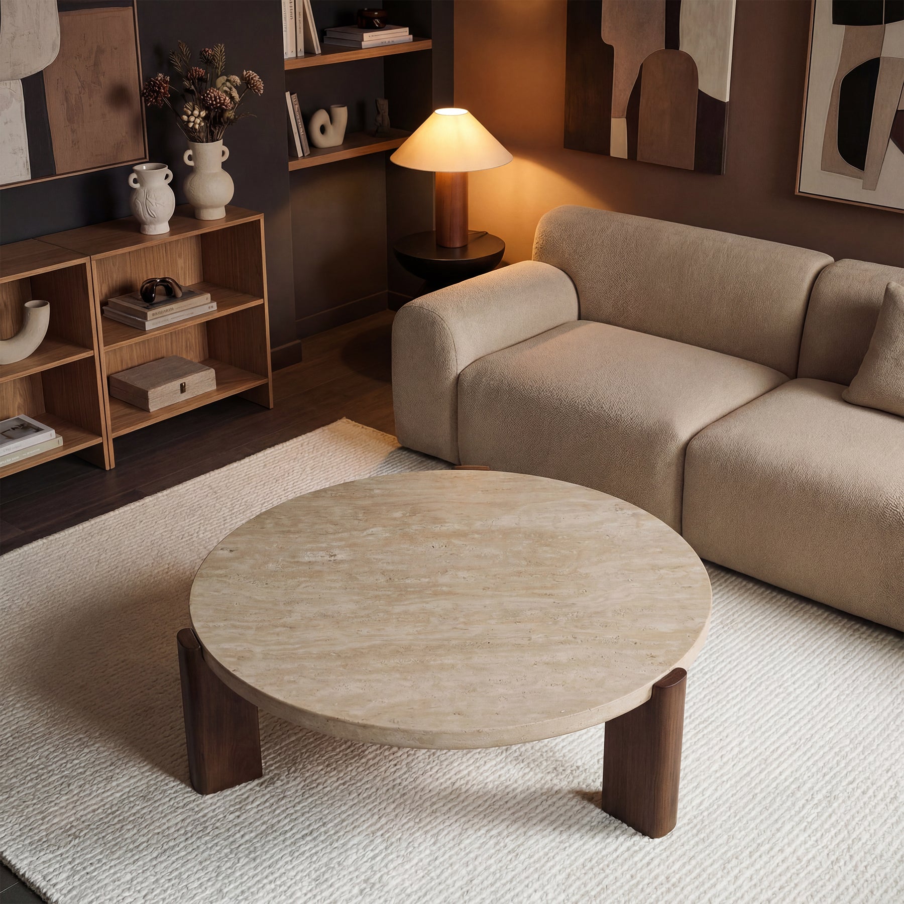 The Amaya Round Coffee Table Set combines a natural travertine top with a solid dark oak base for a timeless modern look. Featuring clean lines, sculptural proportions, and durable materials, this round coffee table set brings warmth, texture, and functional elegance to any modern living room. Perfect for pairing with neutral sofas and contemporary décor, Amaya delivers both style and everyday practicality.