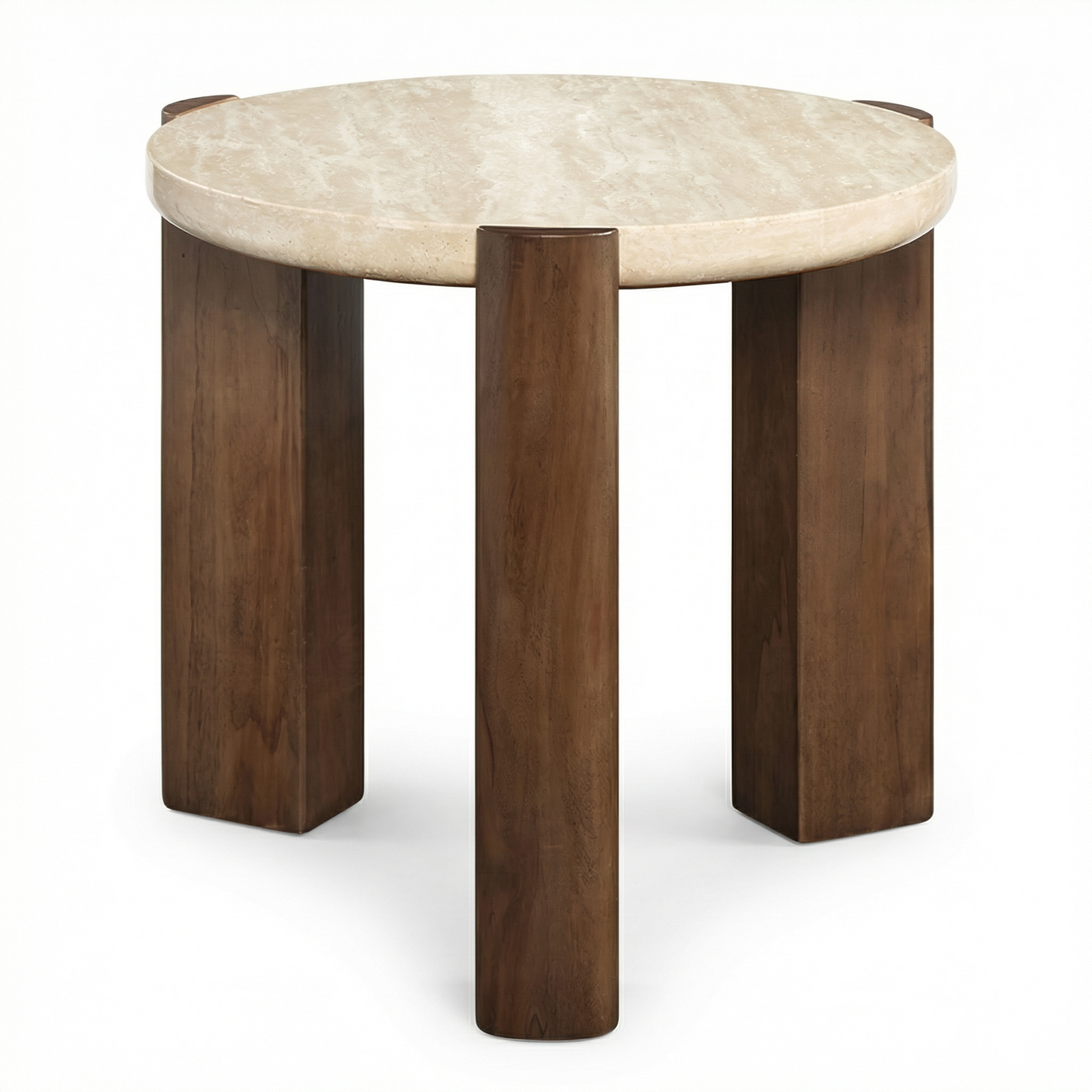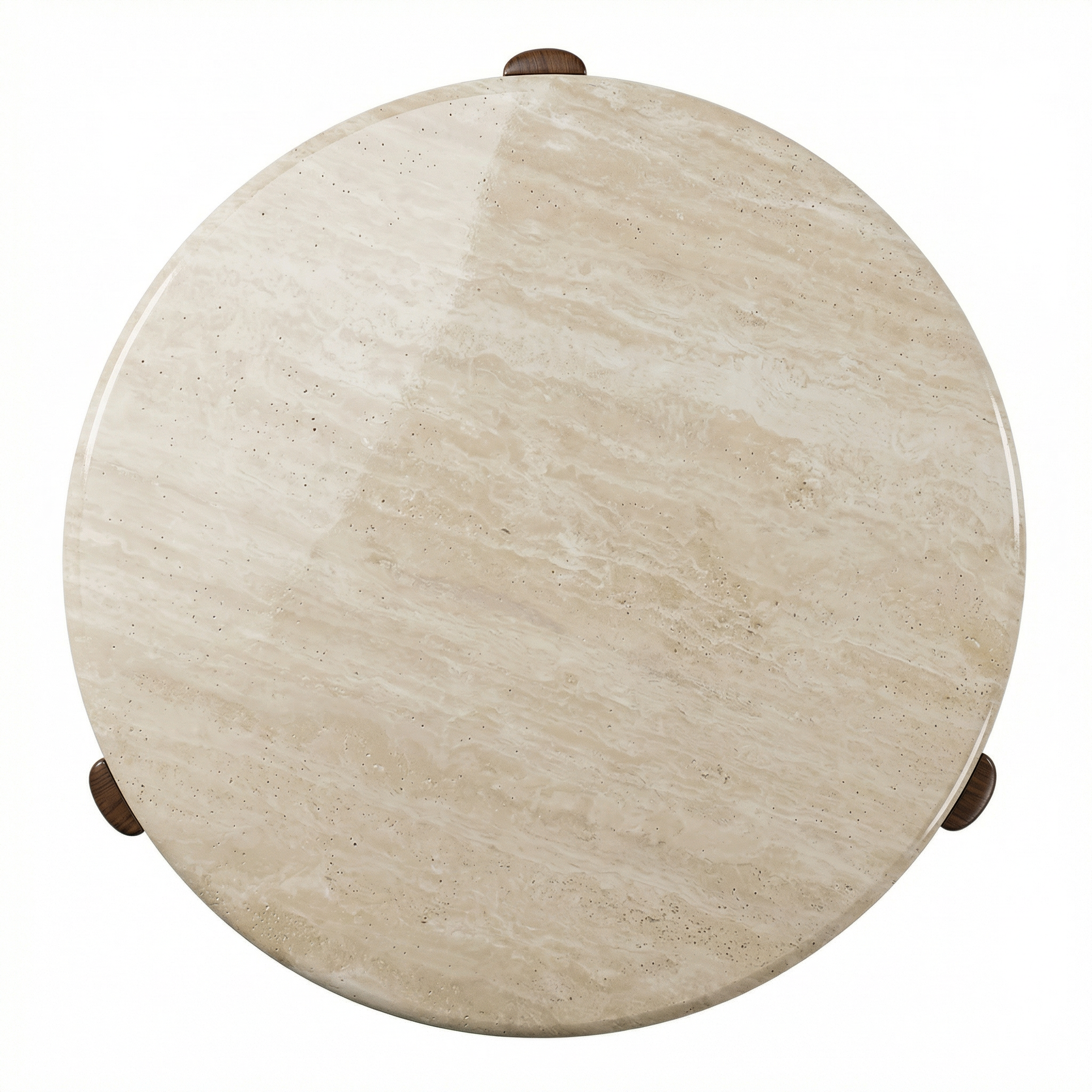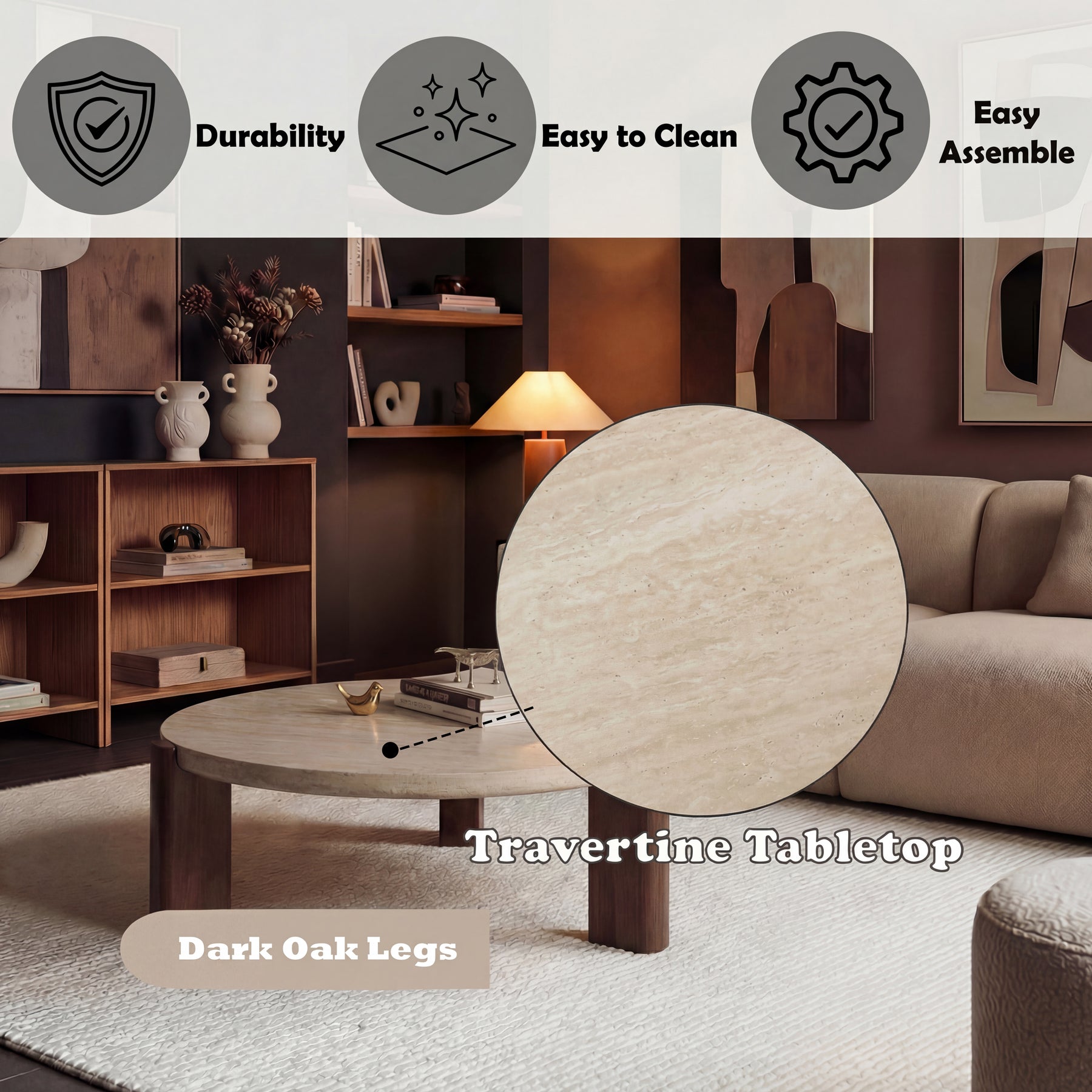 The Amaya Round Coffee Table Set features a genuine travertine stone top with organic veining, bringing a refined, earthy texture to your living room. Each surface is subtly unique, adding depth and character without overpowering the space.