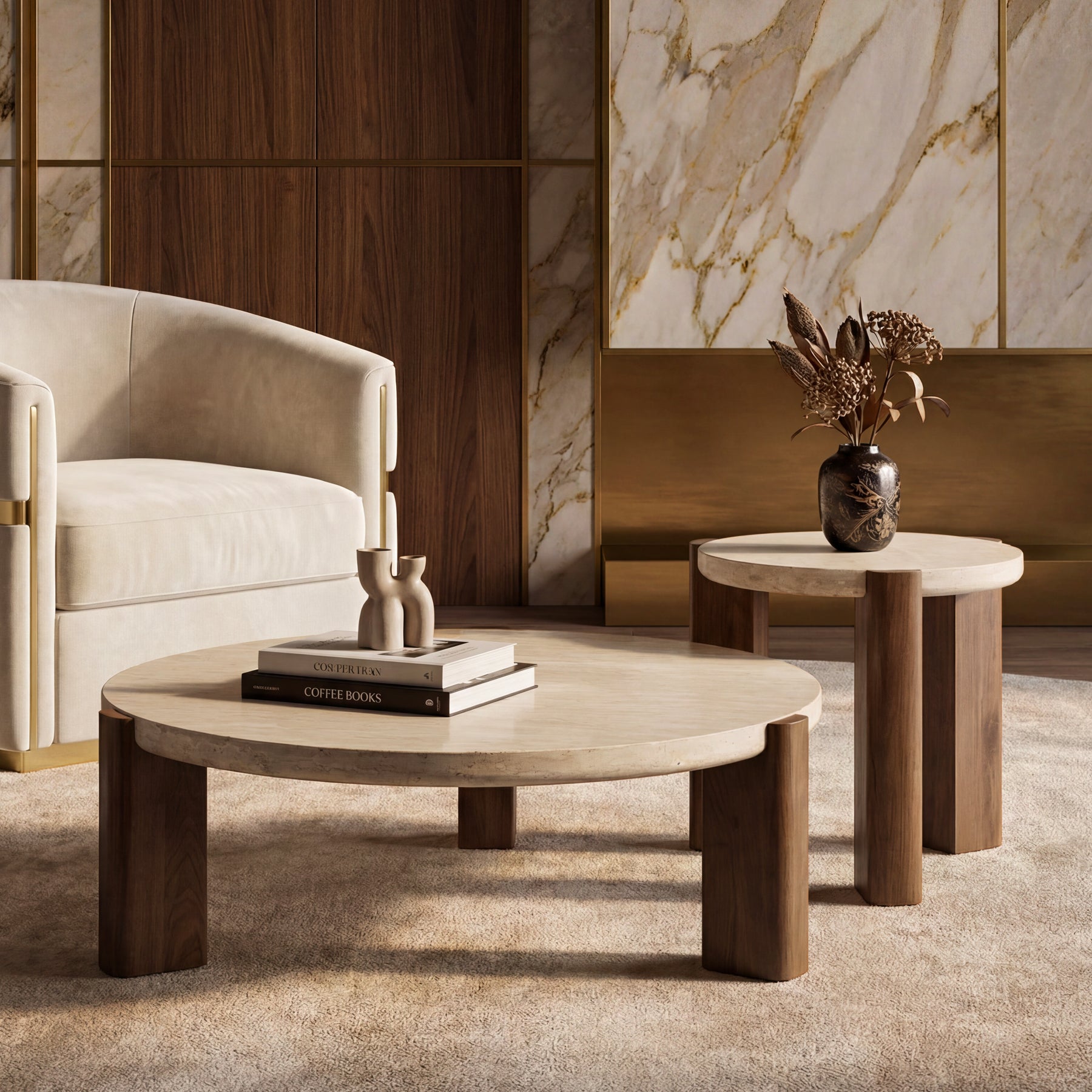 Designed as a round coffee table set, the pairing allows flexible styling—nest them together for layered depth or separate them for functional side-by-side use. Ideal for modern living rooms, apartments, or curated lounge spaces.