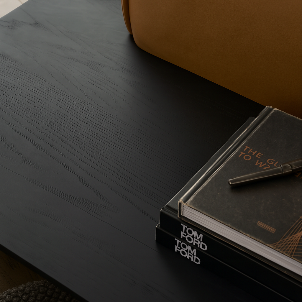 Made with a multi-layer solid wood core and finished in oak veneer with a matte clear coat, the table combines durability and warmth. Natural wood grain adds an organic element that complements the vintage leather perfectly.