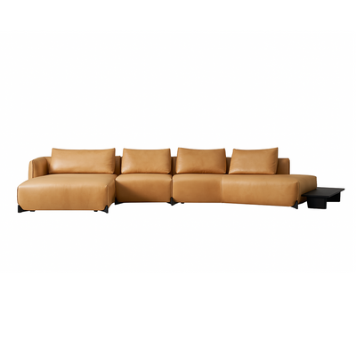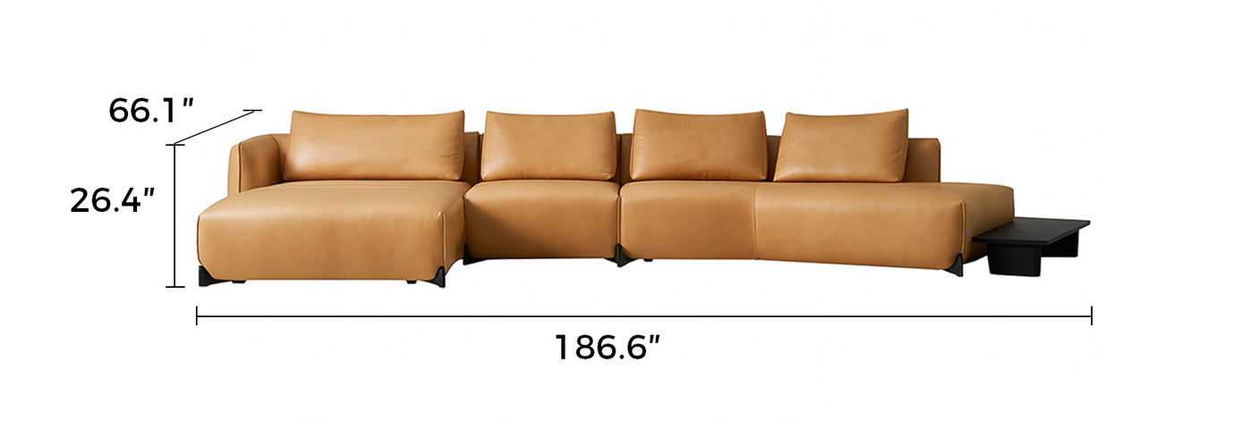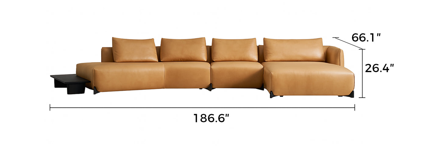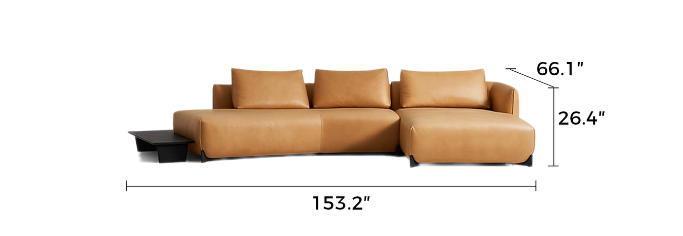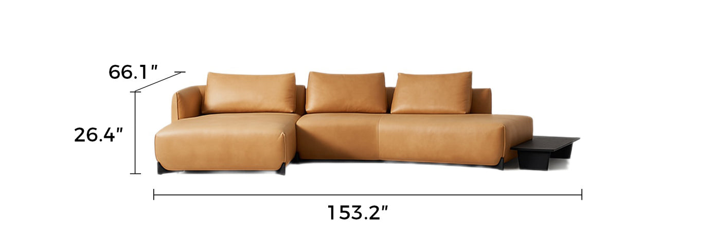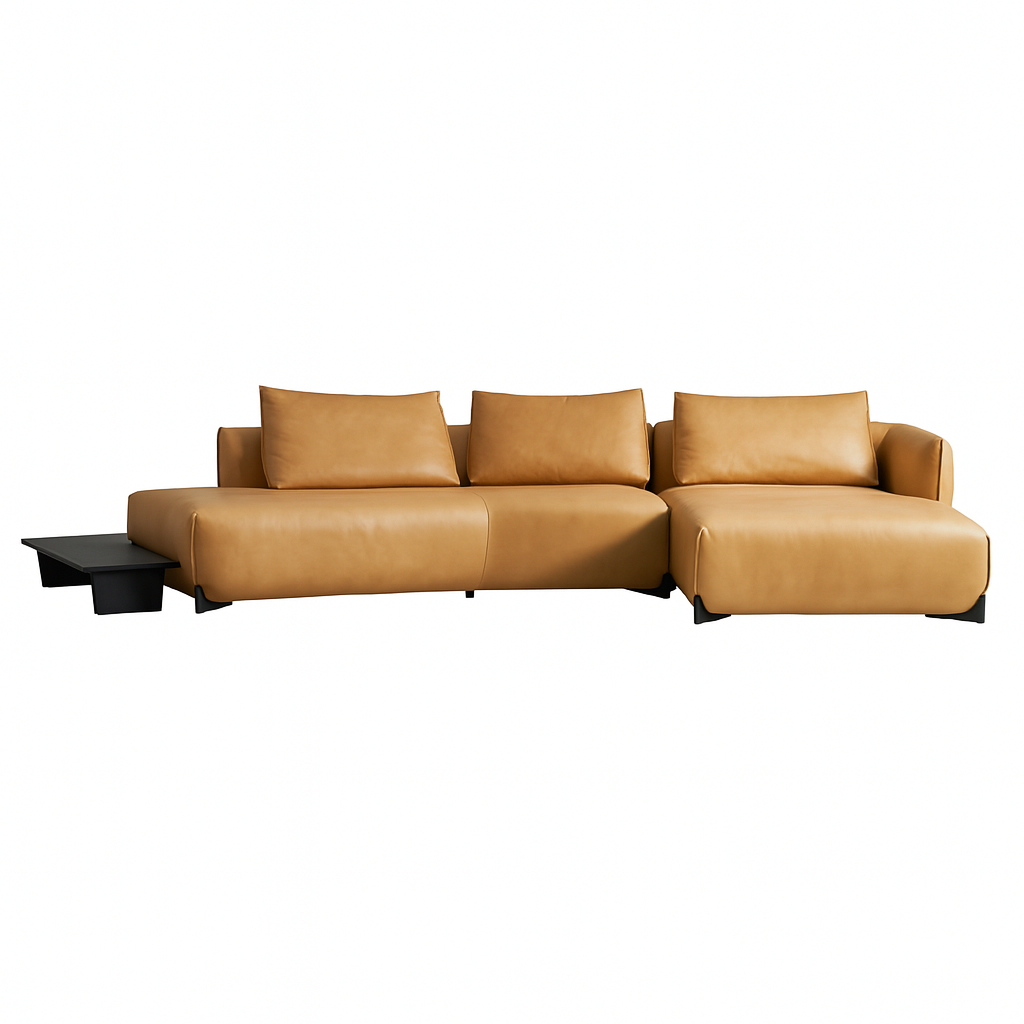 Seamlessly extending from the leather frame, the built-in wood side table offers practical convenience for tea, books, or décor—without interrupting the sofa's flow. Its low profile maintains visual clarity, serving both form and lifestyle.