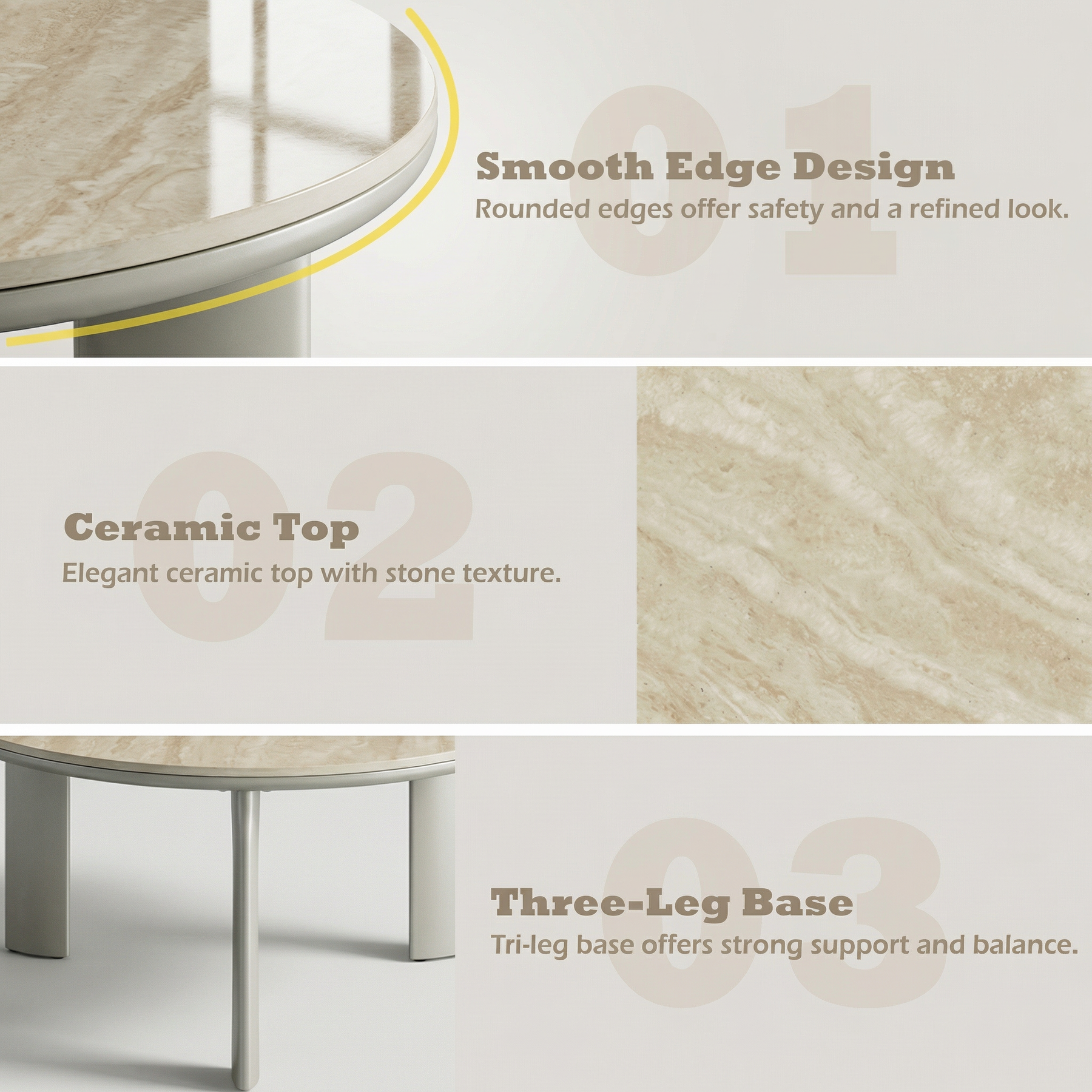 Finished in a soft light gray tone, this round coffee table set blends seamlessly with modern, minimalist, and contemporary living rooms, adding brightness without overpowering your space.