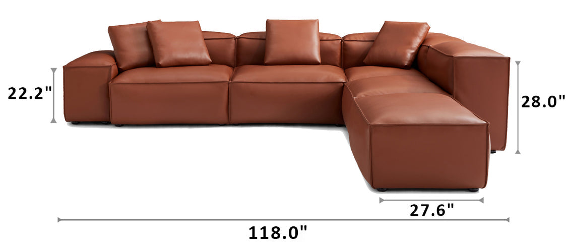 The Cube Modular Brown Genuine Leather Corner Sectional combines contemporary design with lasting comfort. Upholstered in genuine leather, this spacious sectional features a versatile L-Shaped layout, deep seating, and clean lines that bring both style and functionality to your living room. Perfect for gatherings or everyday lounging.