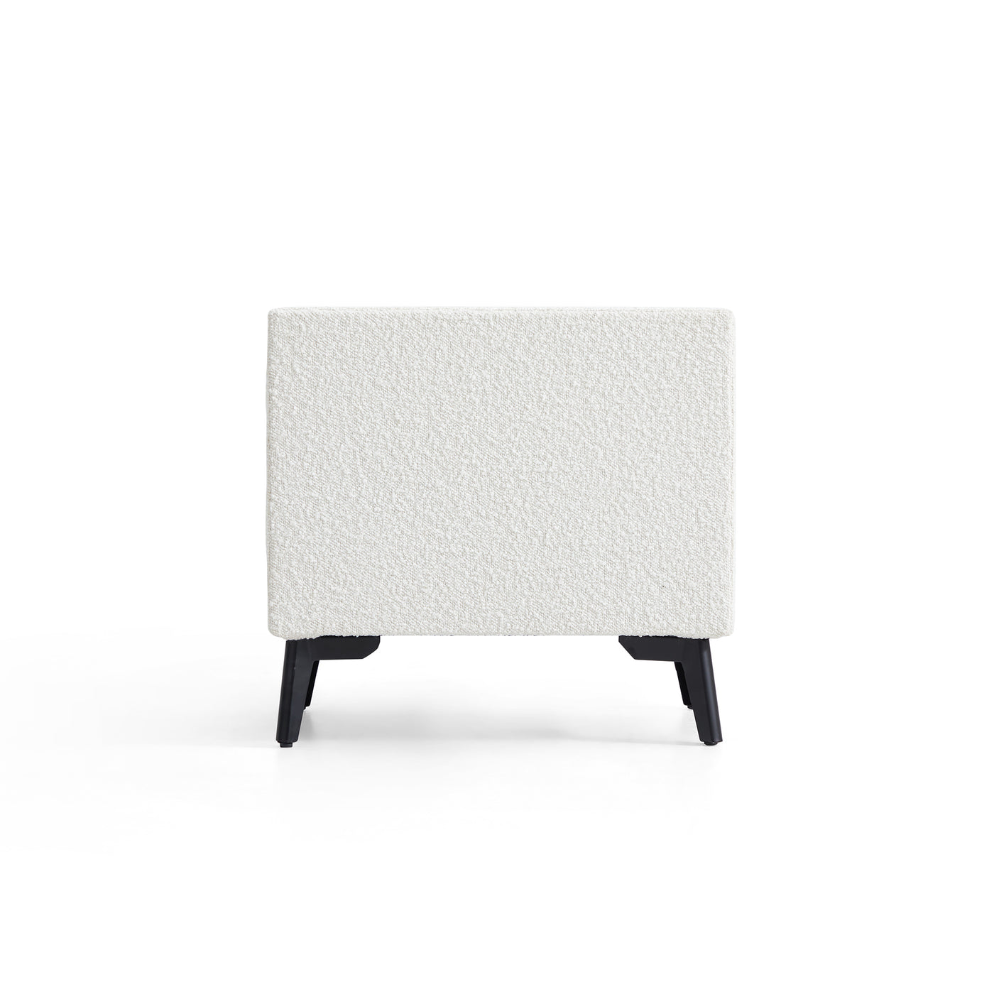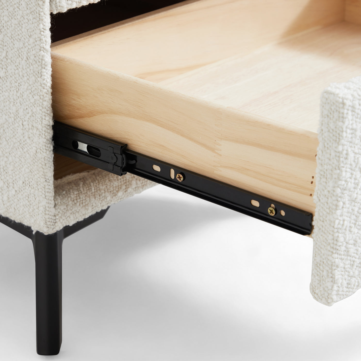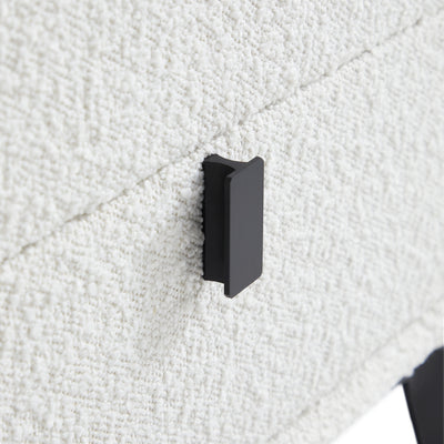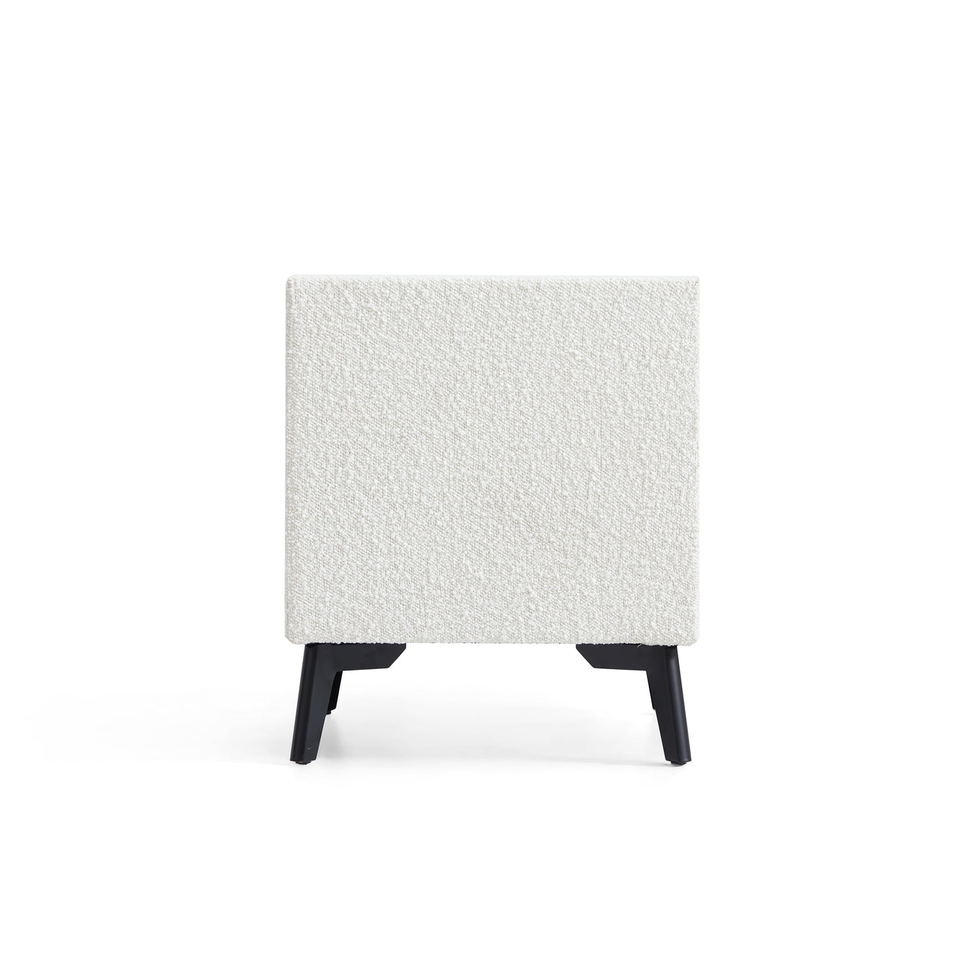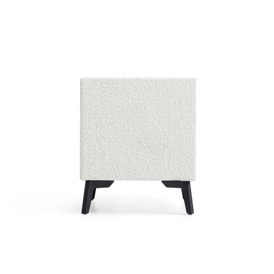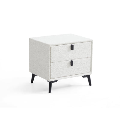 This nightstand features a chic boucle fabric design, adding a soft, textured touch to your bedroom. The creamy color palette complements its minimalist modern style, making it a perfect addition to contemporary interiors. With a practical double-drawer design, it offers ample storage space while maintaining a sleek, elevated look thanks to its high legs. A beautiful blend of form and function, this nightstand brings both style and convenience to your space.