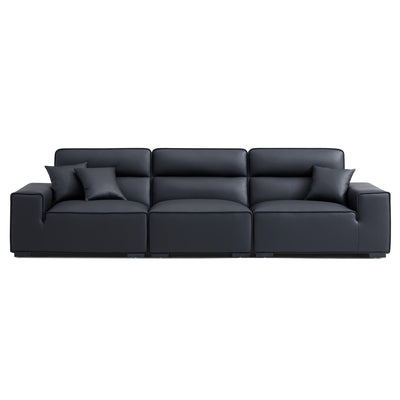 Elevate your living space with the Domus genuine leather sofa, crafted with premium top-grain leather in a sleek black finish. Featuring a high-back design and inspired by Italian minimalism, this sofa combines timeless elegance with exceptional comfort. Perfect for modern living rooms, it offers both style and durability, making it a standout centerpiece for your home.