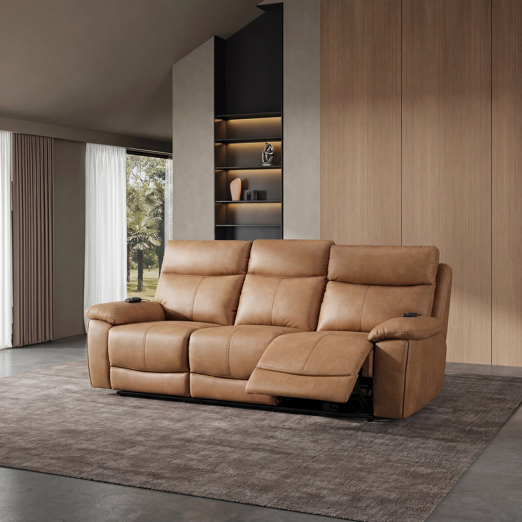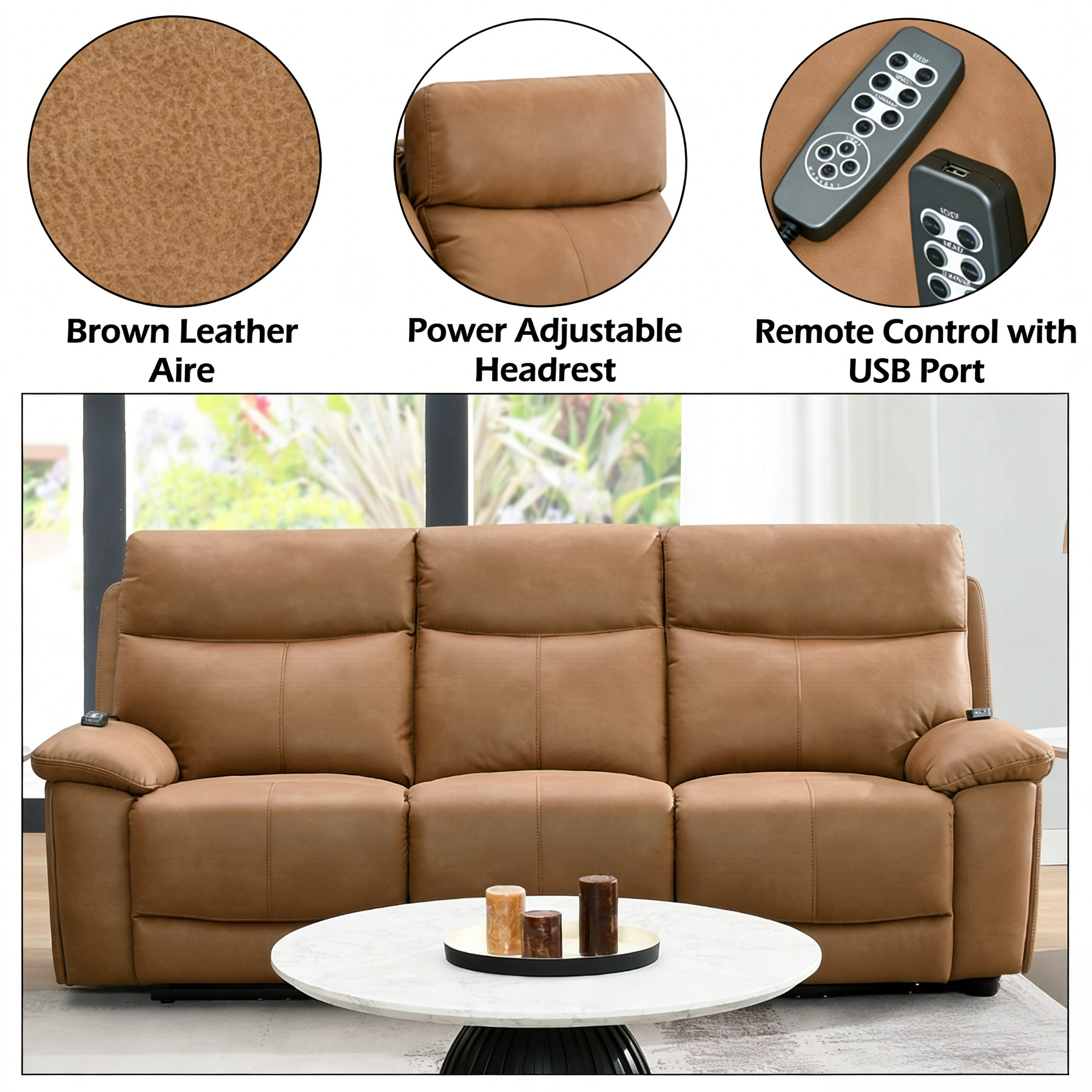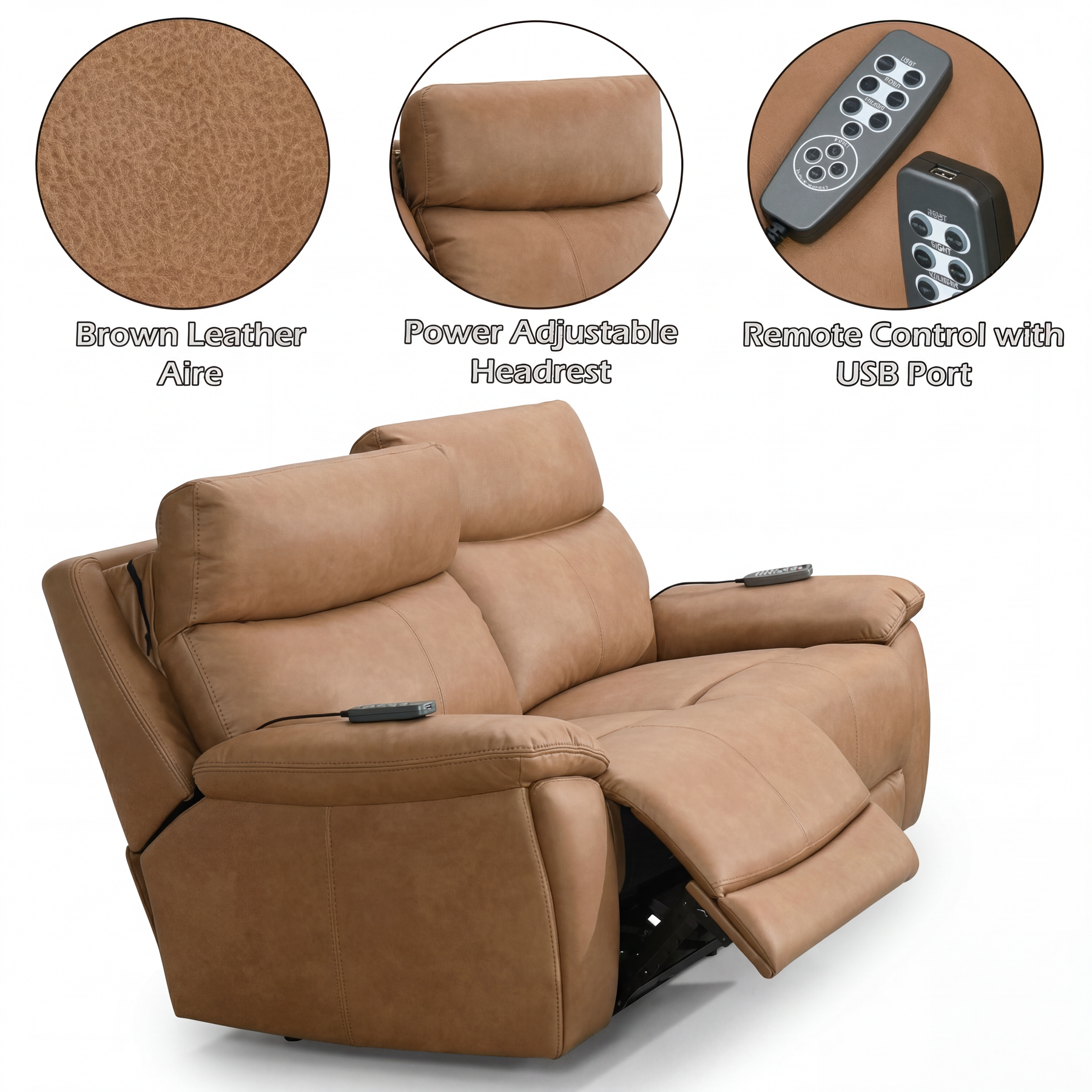 The Gershwin Leather Power Reclining Sofa, Loveseat and Recliner combines modern style with advanced comfort features. Upholstered in brown leatheraire, it includes dual-motor reclining, power headrest, and power lumbar support for customizable relaxation. Built with pocket coil seating and a solid wooden frame, this power reclining set delivers durability, support, and everyday convenience with USB charging and remote control functionality.