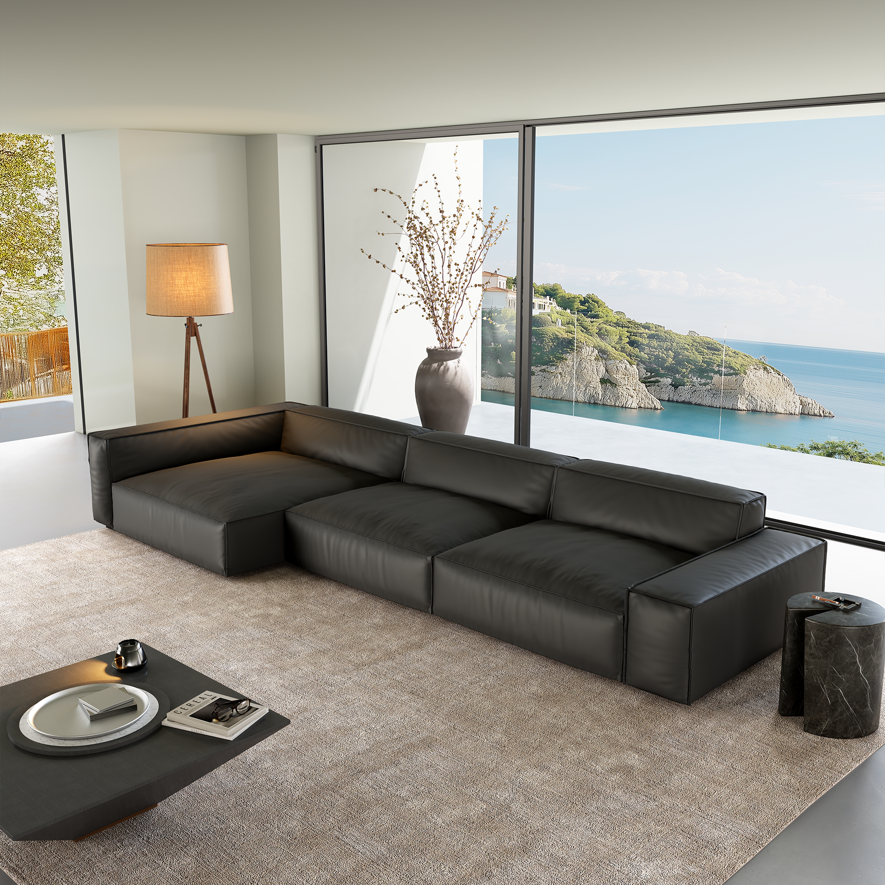Luxury Minimalist Black Leather Sectional-Black