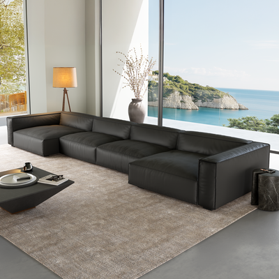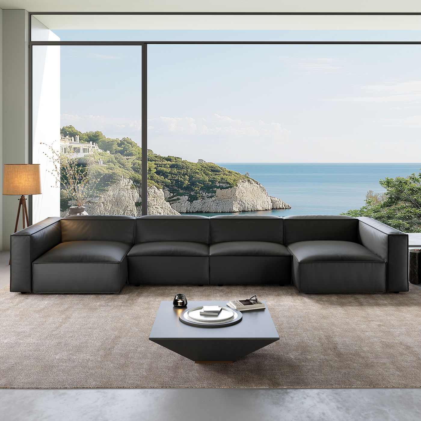Luxury Minimalist Black Leather U Shaped Sectional Sofa-Black