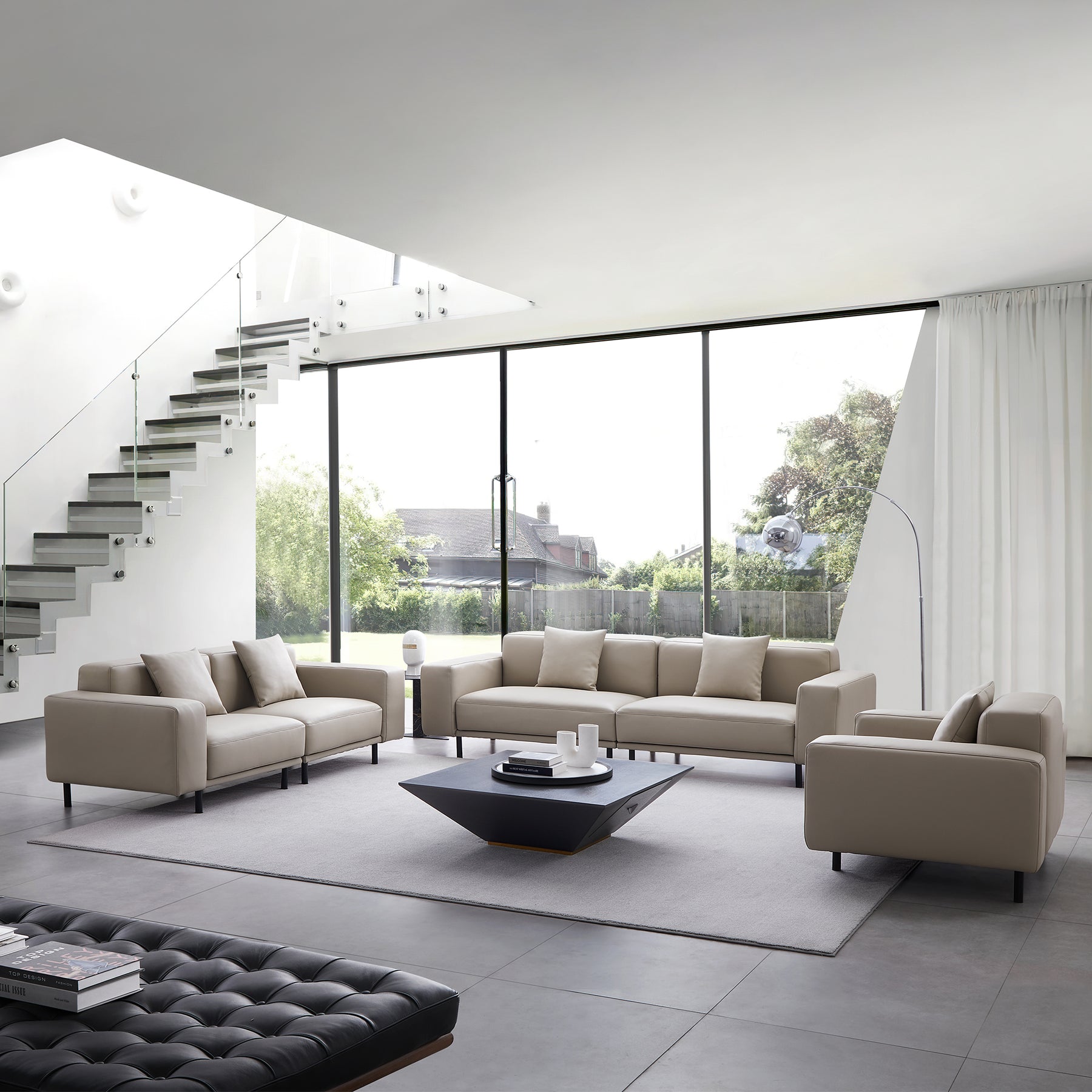 Elevate your style with chic black metal legs in our Noble Beige Leather Sofa Set, combining stability and sophistication.
