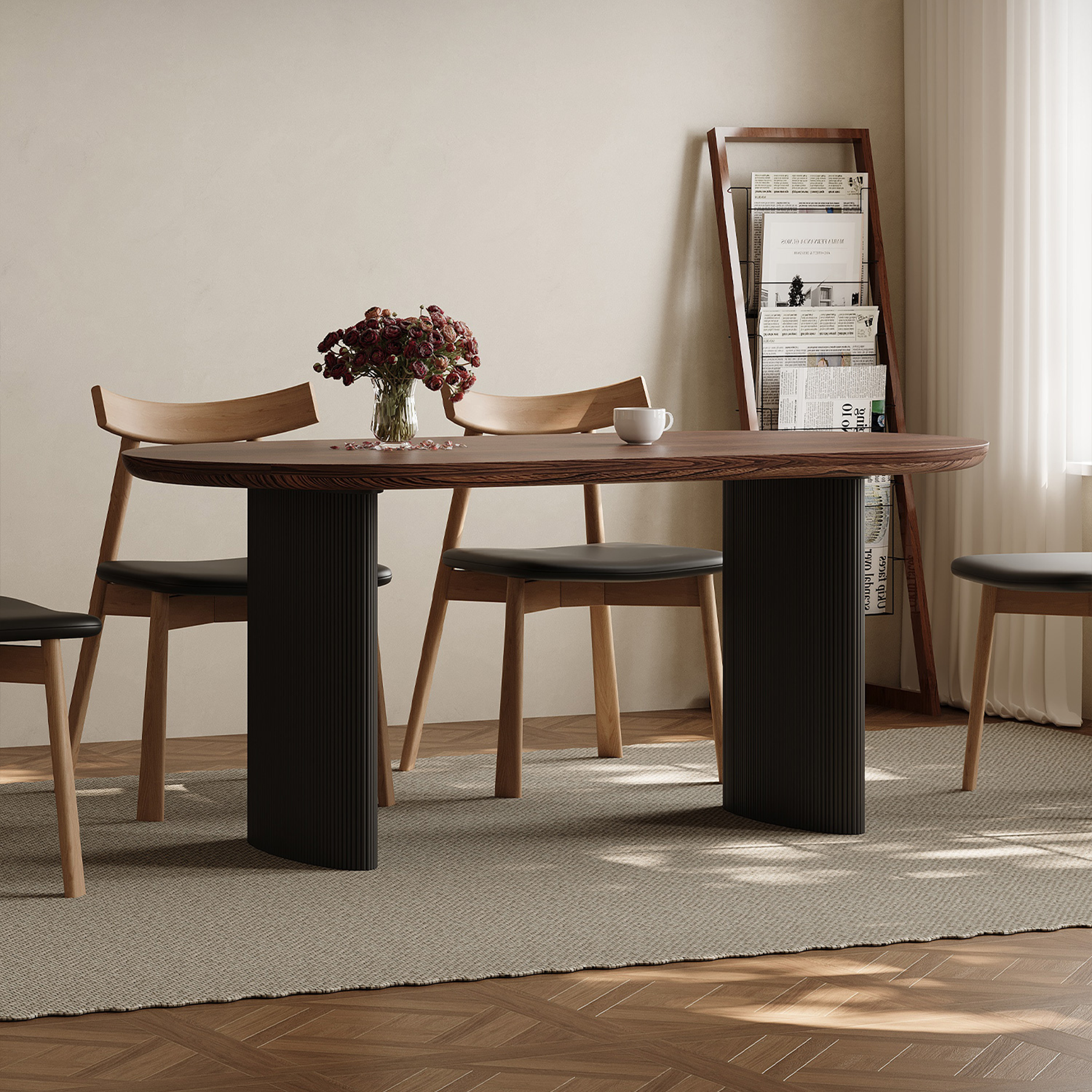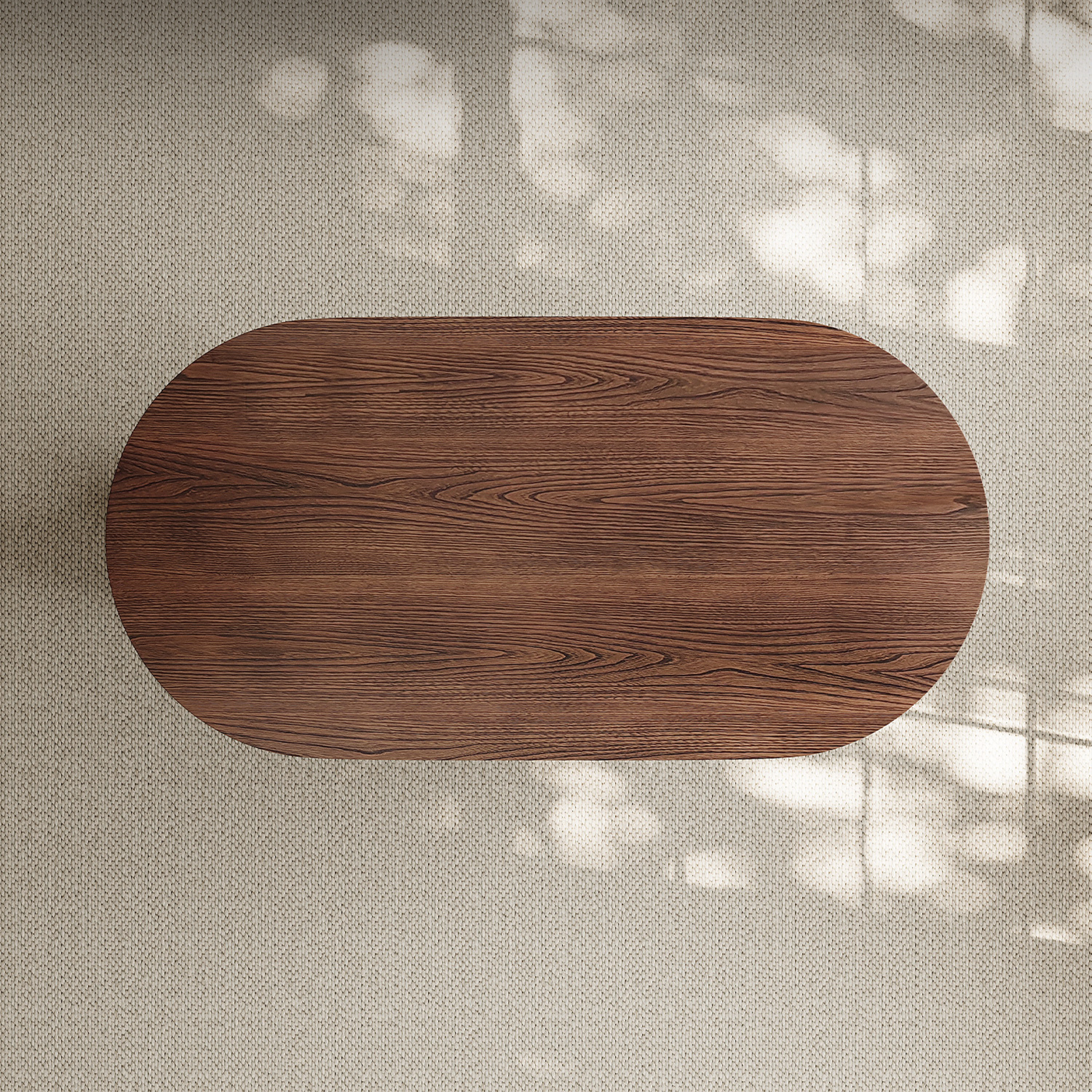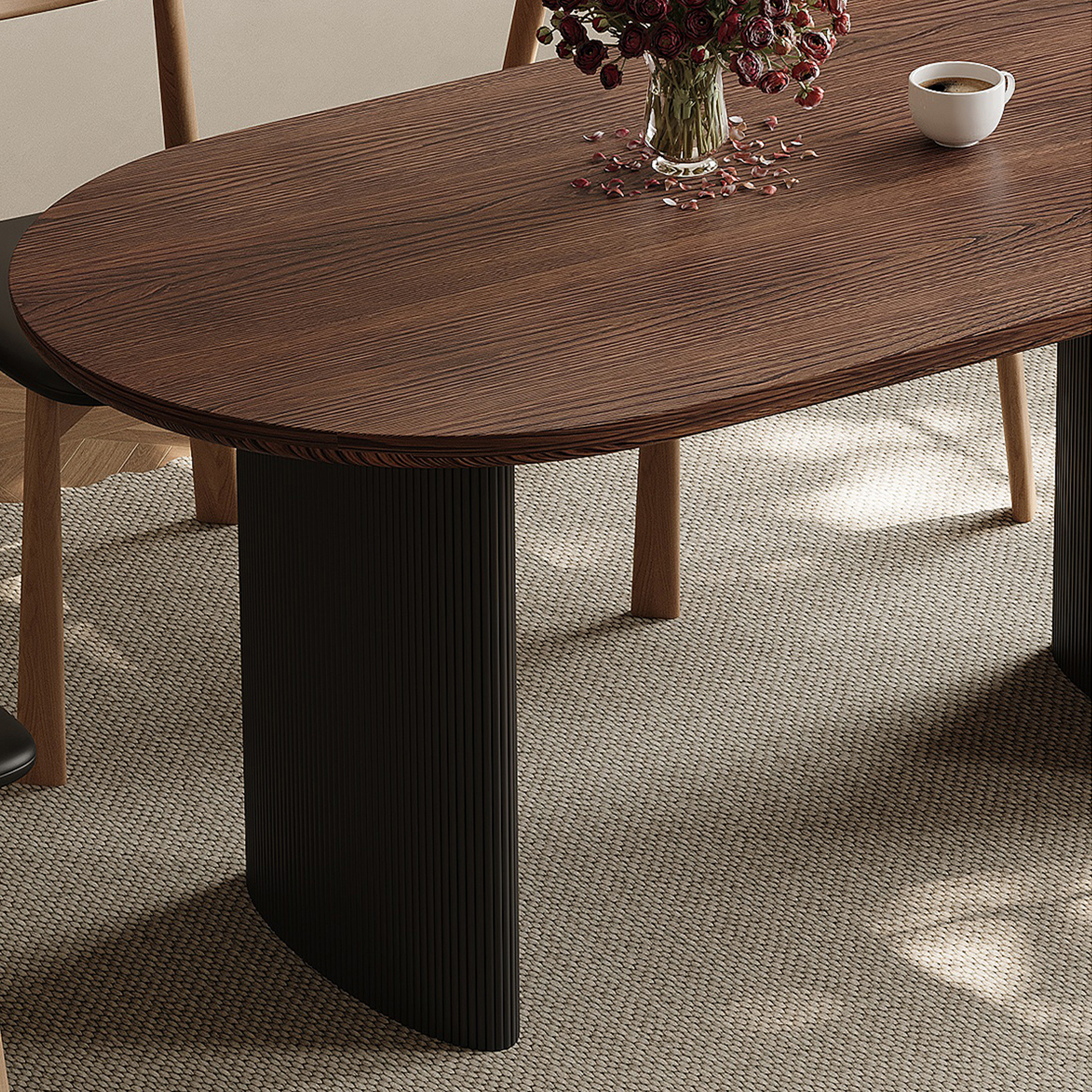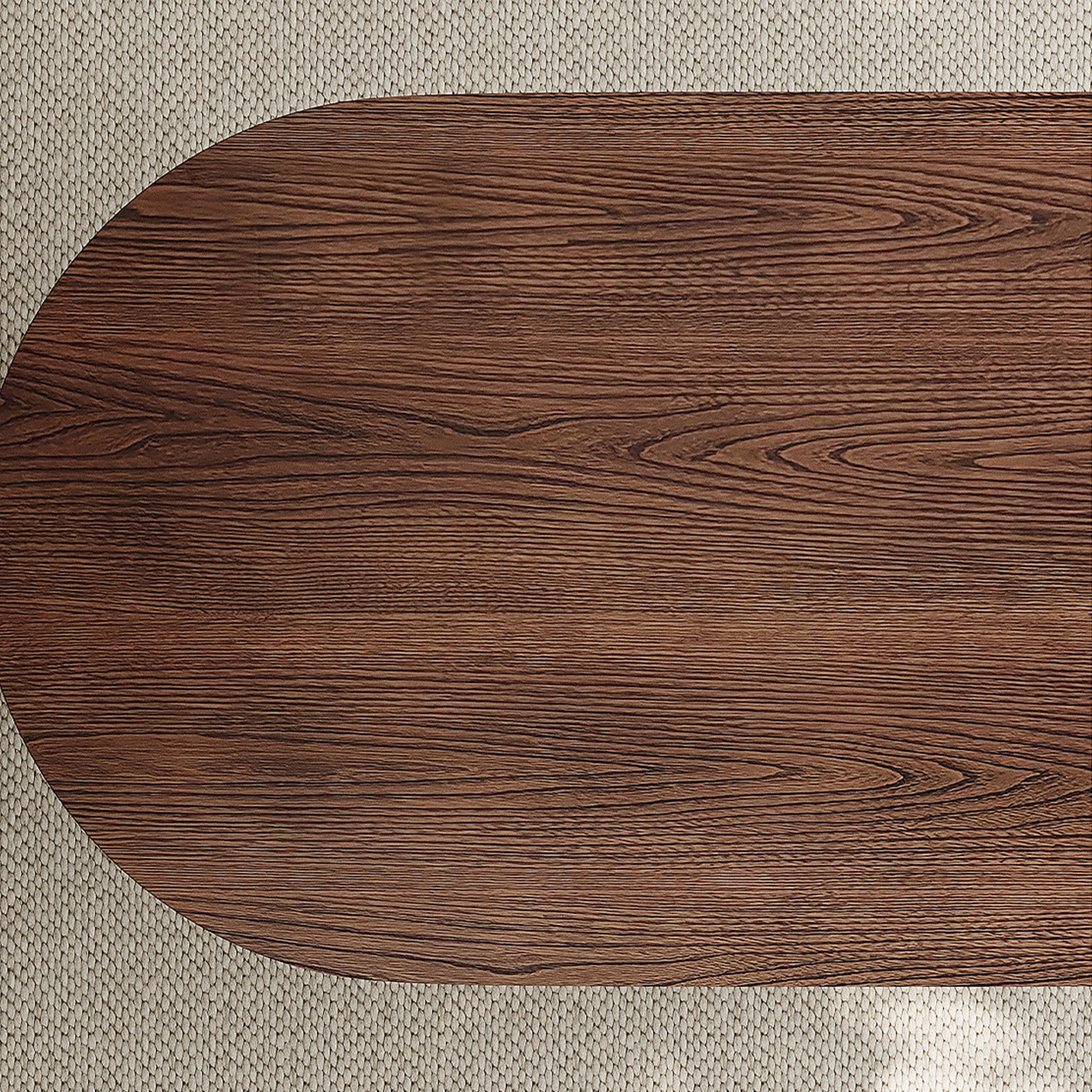Crafted with a rich walnut elm-veneer top, this table brings a warm, organic tone that elevates any dining space. The smooth, elongated oval silhouette softens the room and adds an understated designer aesthetic.